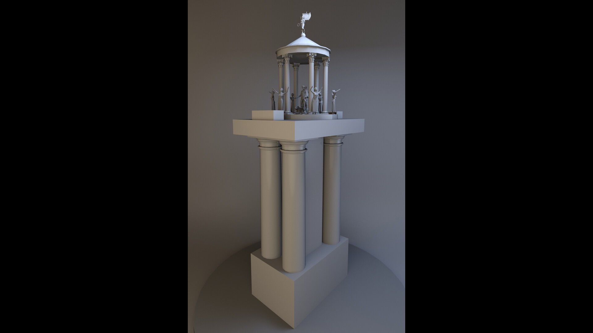(3) <Ἔστω> βάσις μῆκος ἔχουσα ὡς πήχεος, πλάτος δὲ ὡς παλαιστῶν τεσσάρων, ὕψος δὲ ὡς παλαιστῶν τριῶν, κυμάτιον ἔχουσα περιτρέχον εἴς τε τὸ ἄνω καὶ τὸ κάτω μέρος. ἐπὶ δὲ τῶν γωνιῶν αὐτῆς ἐφέστηκε κιόνια τέσσαρα, ὕψος μὲν ἔχοντα ὡς παλαιστῶν ηʹ, πλάτος δὲ παλαιστῶν δύο, ἔχοντα ὑποκείμενα σπειρία καὶ τούτοις ἁρμοζούσας κεφαλὰς ἐπικειμένας. ἐπὶ δὲ τῶν κεφαλίων ἐπίκειται καθάπερ ἐπιστύλιον κύκλῳ ὕψος ἔχον ὄγδοον τοῦ κίονος ὅλου, ὡς δακτύλων εʹ. κατὰ δὲ τῶν ἐπιστυλίων κατέστρωται σανίδια καλύπτοντα τὴν ἐπάνω ἐπιφάνειαν, καὶ περίκειται κύκλῳ κυμάτιον. ἐπὶ δὲ τοῦ καταστρώματος ἐφέστηκε μέσον ναΐσκος στρογγύλος περιφανὴς ἔχων κίονας ἕξ. ἐπὶ δὲ τούτου πυργίον κωνοειδὲς ἐφέστηκεν ἐντεταμένην ἔχον τὴνἐπιφάνειαν, καθάπερ εἴρηται. ἐπὶ δὲ τῆς κορυφῆς ἐφέστηκε Νίκη ἐκπεπετακυῖα τὰς πτέρυγας καὶ ἐν τῇ δεξιᾷ χειρὶ στέφανον κατέχουσα. ἐν δὲ μέσῳ τοῦ ναΐσκου ζῴδιον Διονύσου ἐφέστηκεν ἐν μὲν τῇ ἀριστερᾷ χειρὶ θύρσον κατέχον, ἐν δὲ τῇ δεξιᾷ σκύφον. παρακαθέζεται δὲ πανθηρίσκος πρὸς τοῖς τοῦ Διονύσου ποσίν. ἐν δὲ τοῖς ἔμπροσθεν καὶ τοῖς ὄπισθεν μέρεσιτοῦ Διονύσου ἐπὶ τοῦ καταστρώματος βωμὸς ἐπίκειται ἔχων ξύσματα τῶν σανίδων τεκτονικὰ ξηρὰ ὥστε εὔκαυστα εἶναι. κατὰ δὲ κίονα τῶν ἐν τῷ ναΐσκῳ τοῦ Διονύσου παρέστηκεν ἐκτὸς τοῦ ναΐσκου Βάκχη διεσκευασμένη ὡς ἄν τις προαιρῆται.