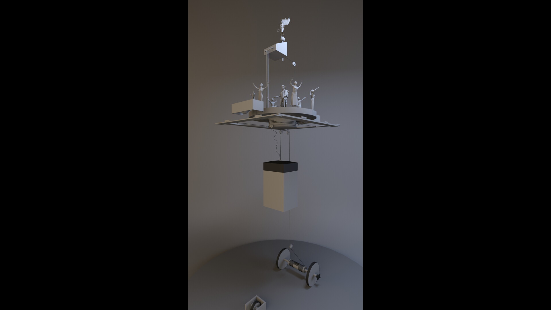 Le théâtre automatique à base mobile est l’automate le plus complexe que nous avons restitué. Il utilise plusieurs principes mécaniques différents : usage de la pneumatique, système de cordage pré-programmé et contrepoids-moteur. Nous allons décrire une à une les différentes parties de la machine afin de mieux comprendre comment elle fonctionne. Le schéma propose différents mécanismes du théâtre et pose les bases du travail de restitution.