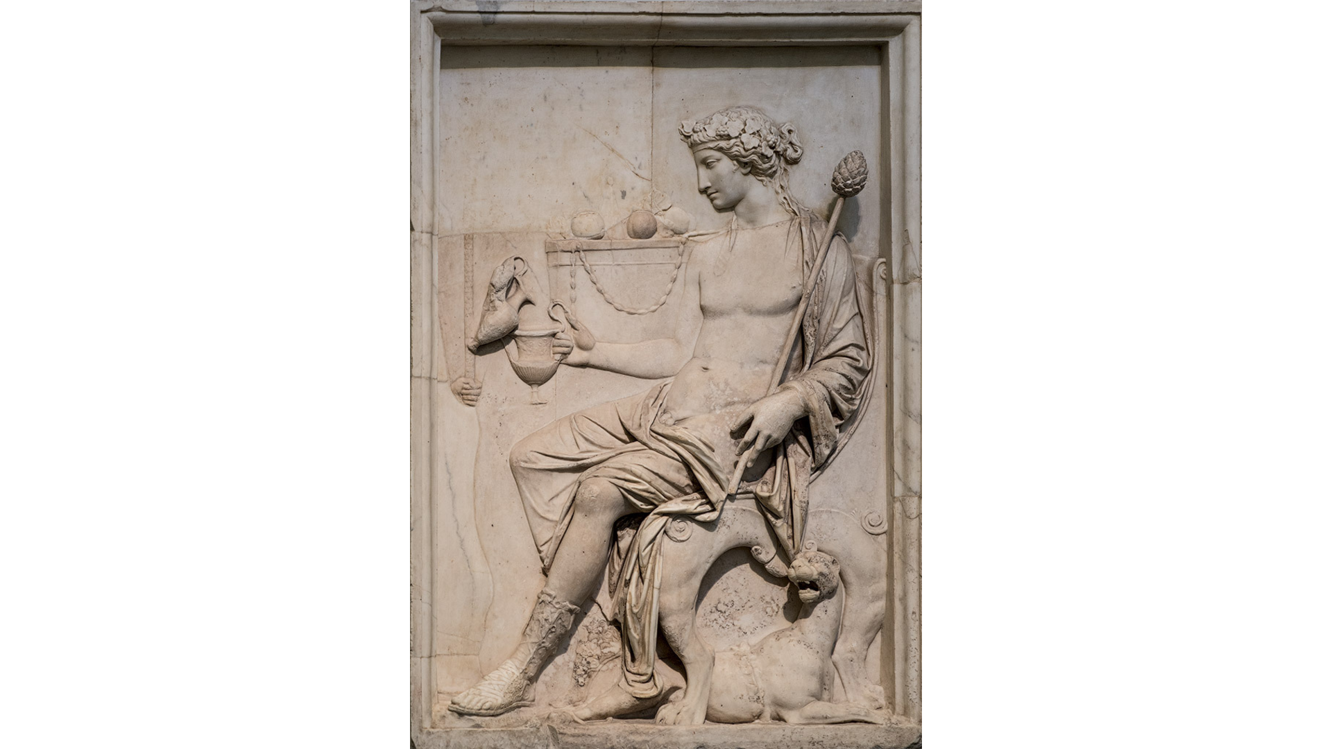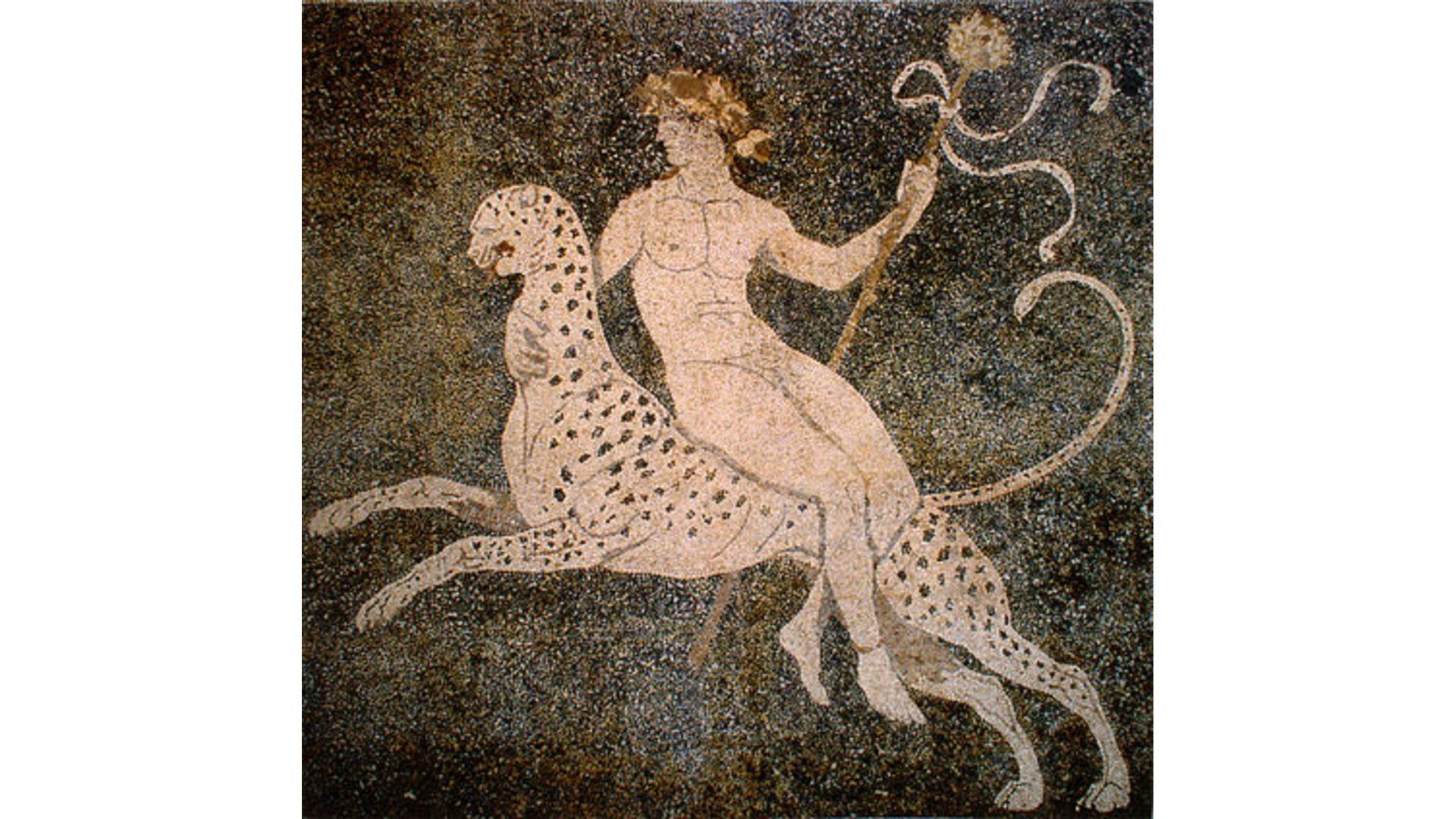 2. L’autel (situé en avant de Bacchus) s’allume et du lait ou de l’eau jaillit de son thyrse, tandis que sa coupe verse du vin sur la panthère.