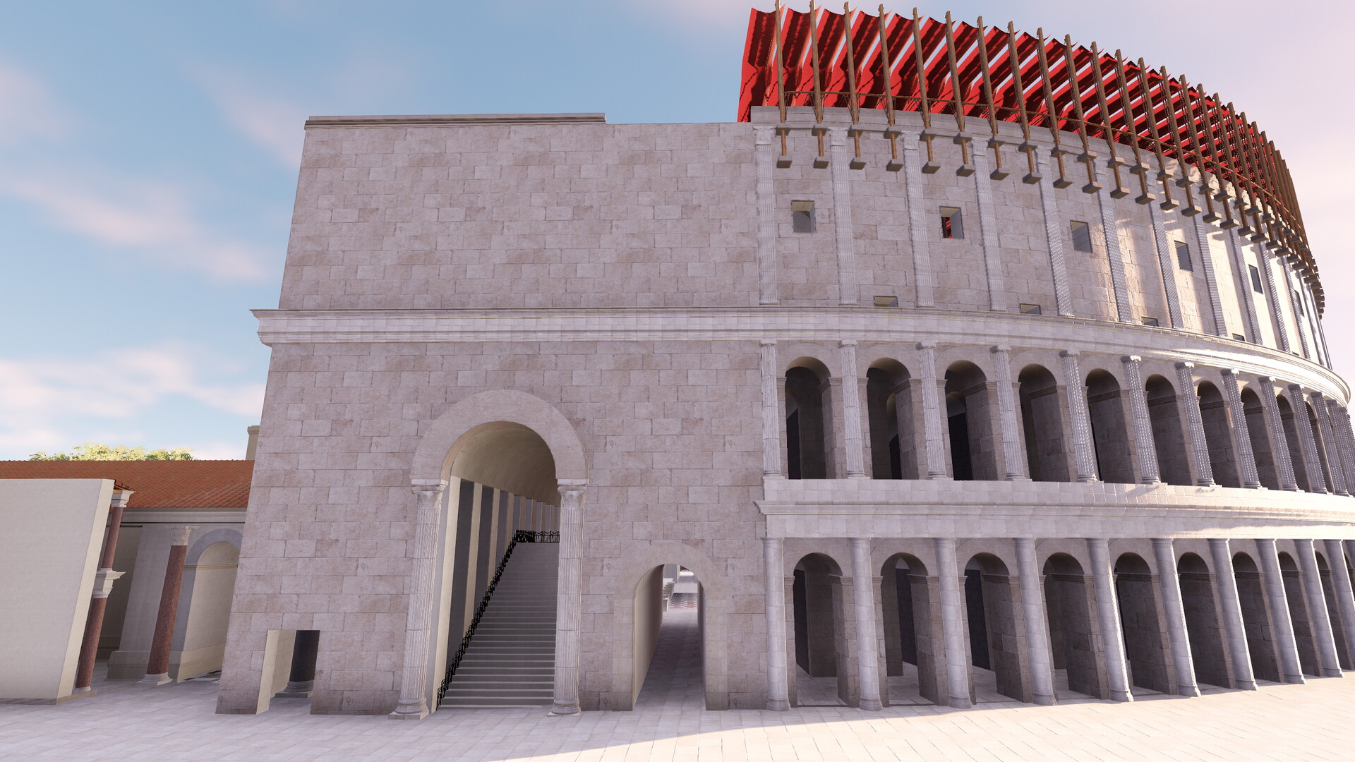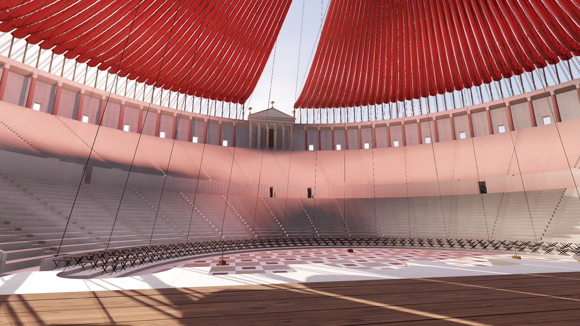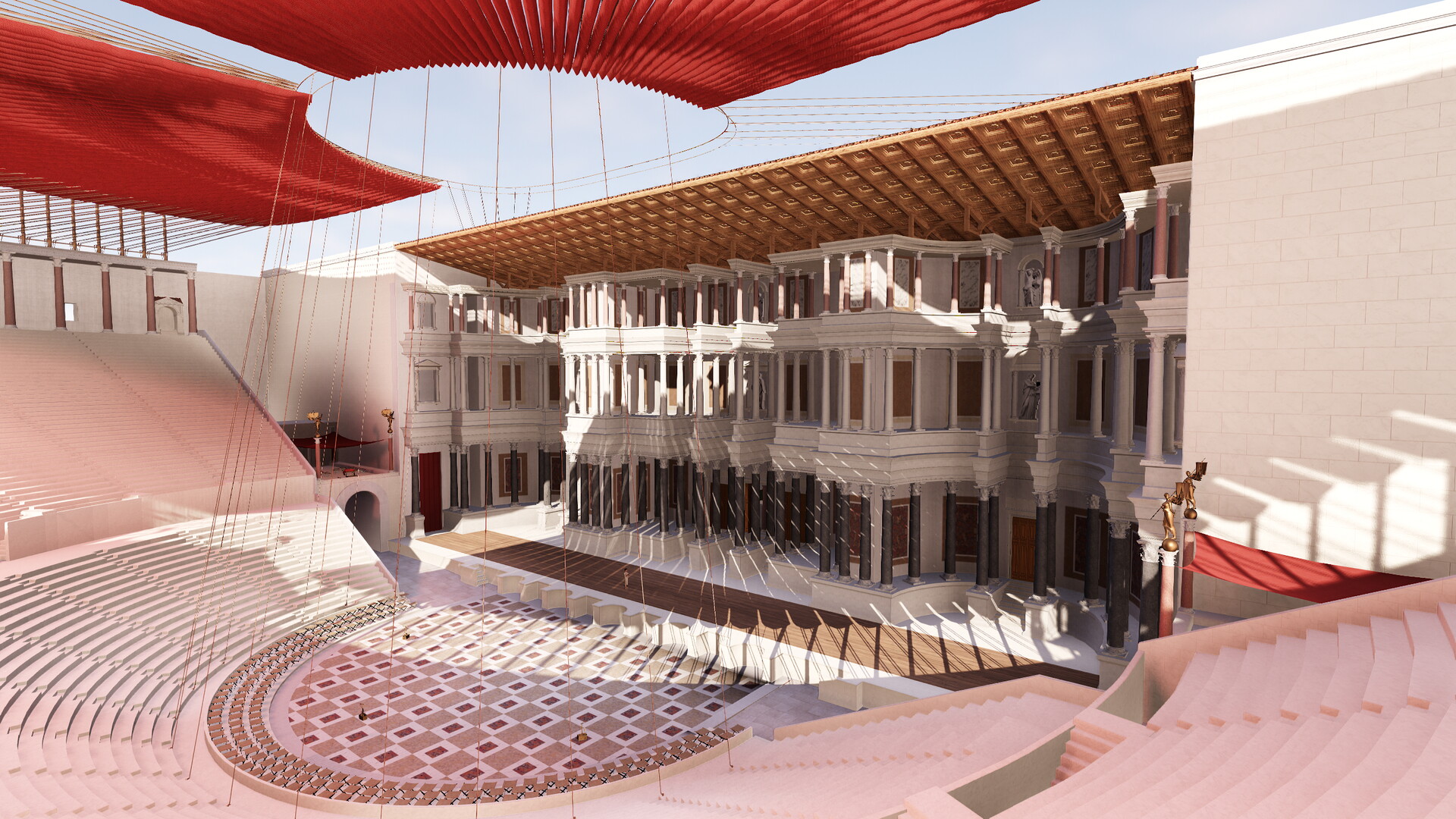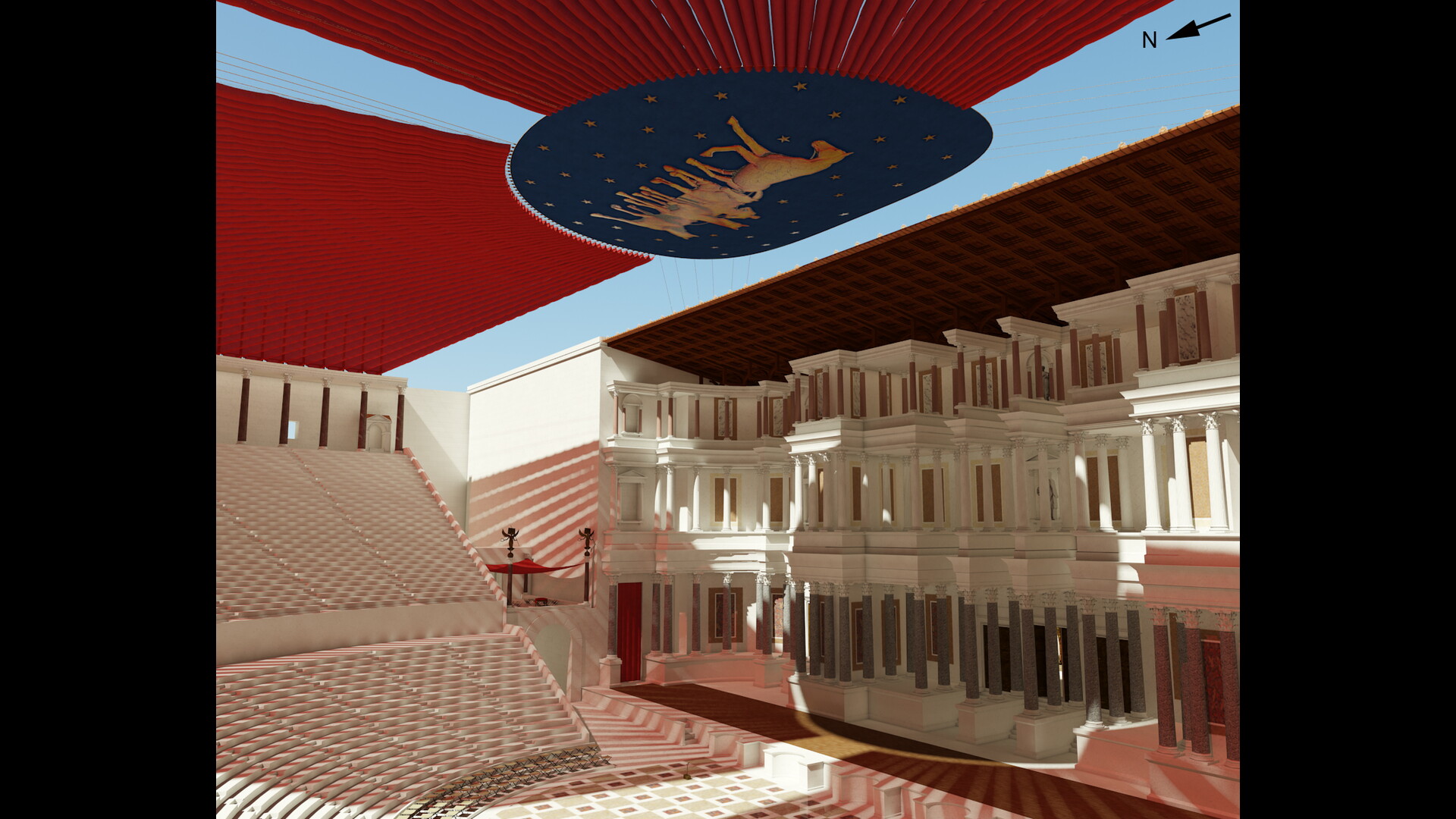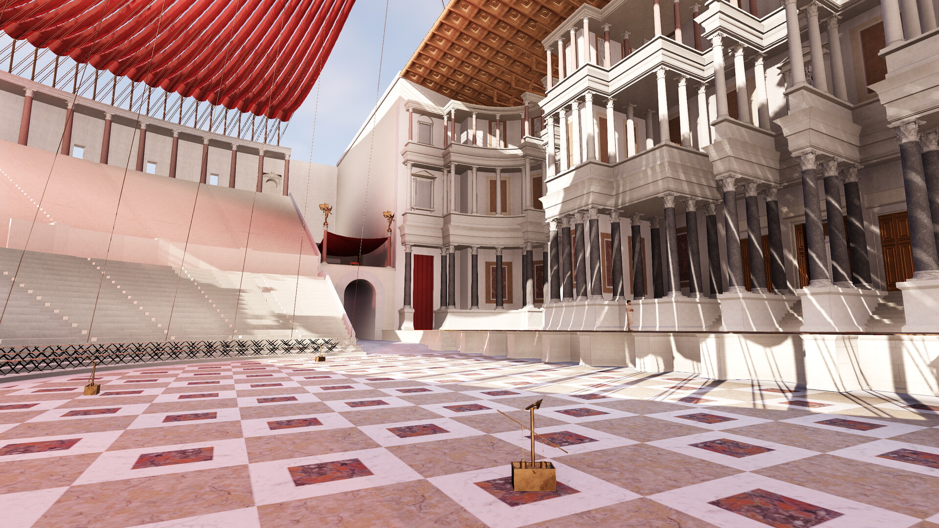 Deux systèmes de vélums, fondés sur une analyse des sources anciennes, ont été été expérimentés en réalité virtuelle sur le théâtre de Pompée : un vélum soutenu par des vergues, fixées à 90° des mats entourant la cauea et un vélum soutenu par des cordes reliés entre ces mêmes mâts et ceux implantés à l’arrière du mur de scène.