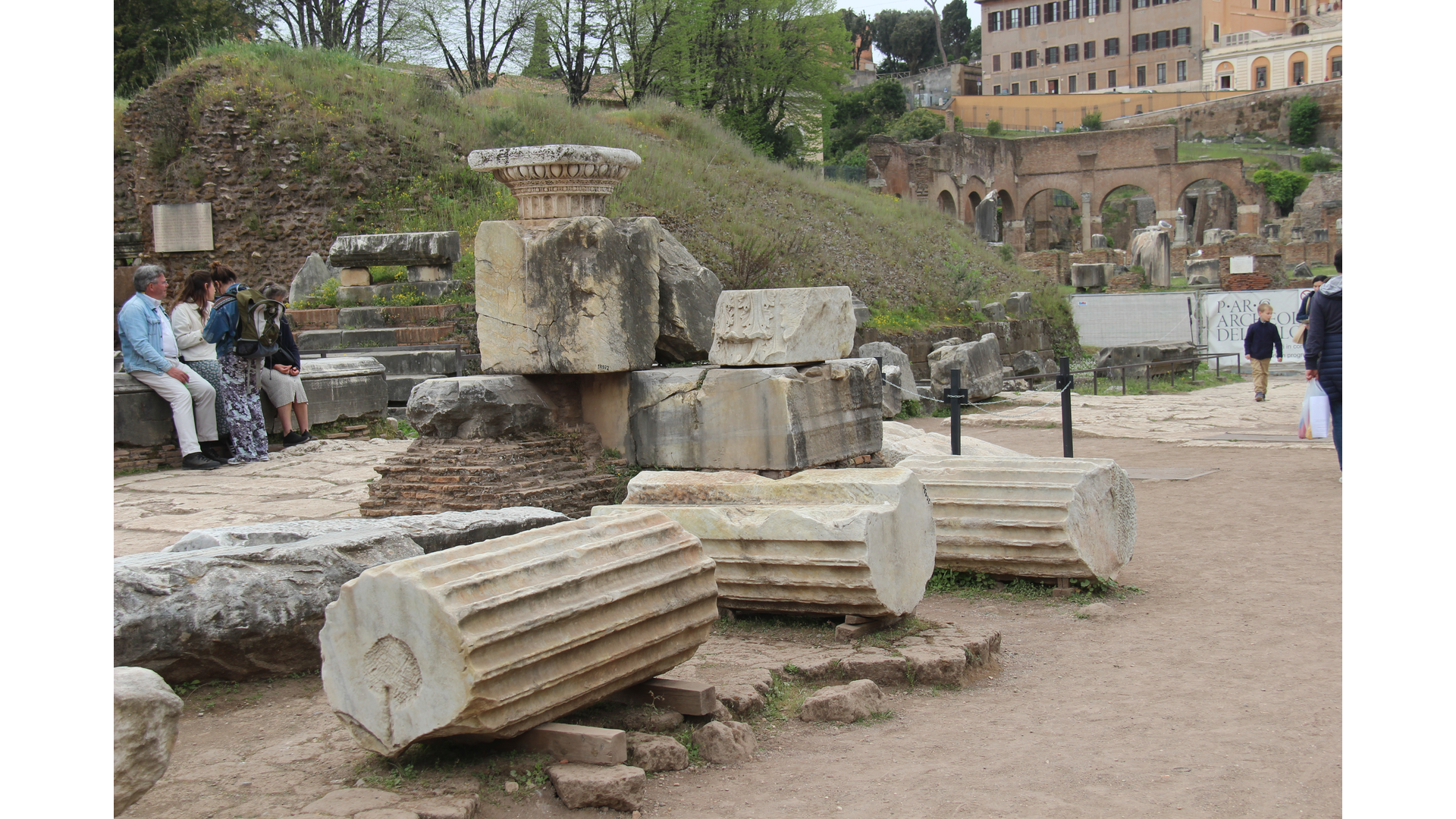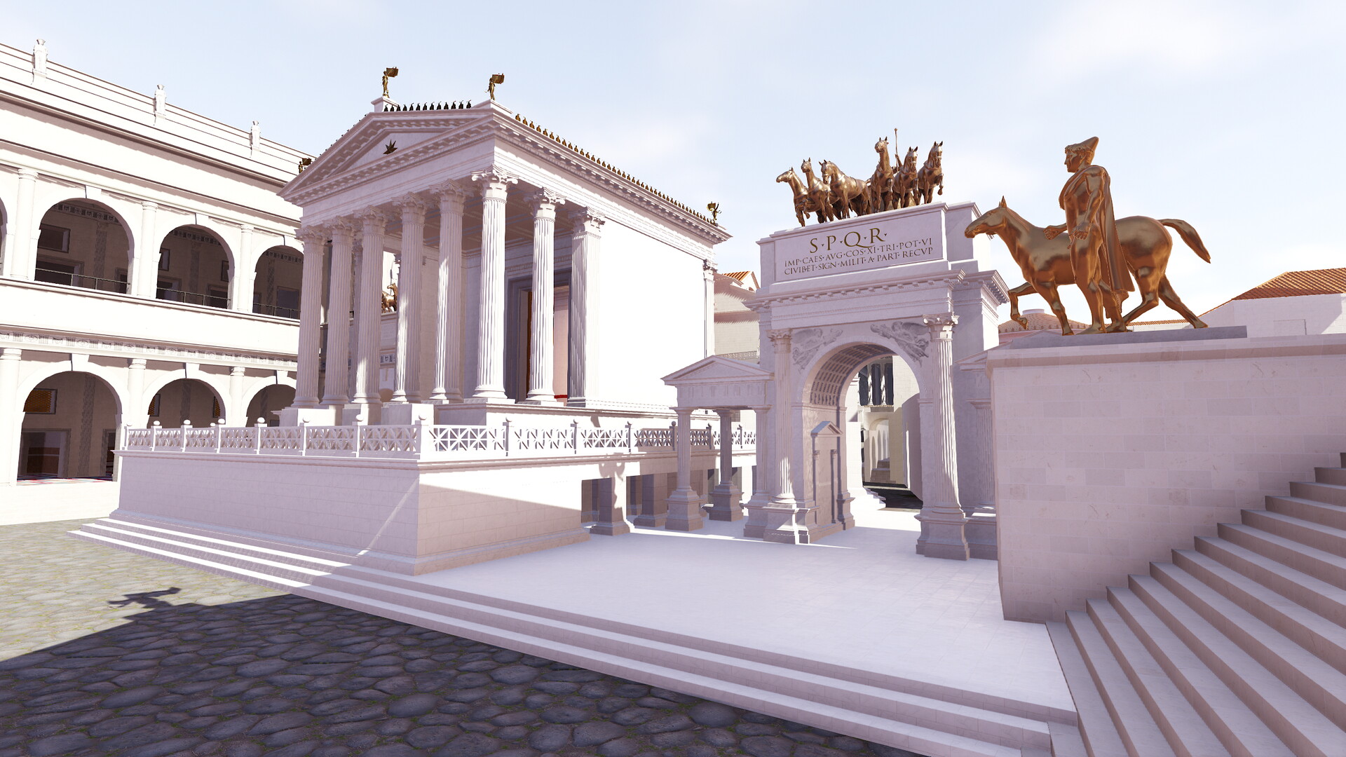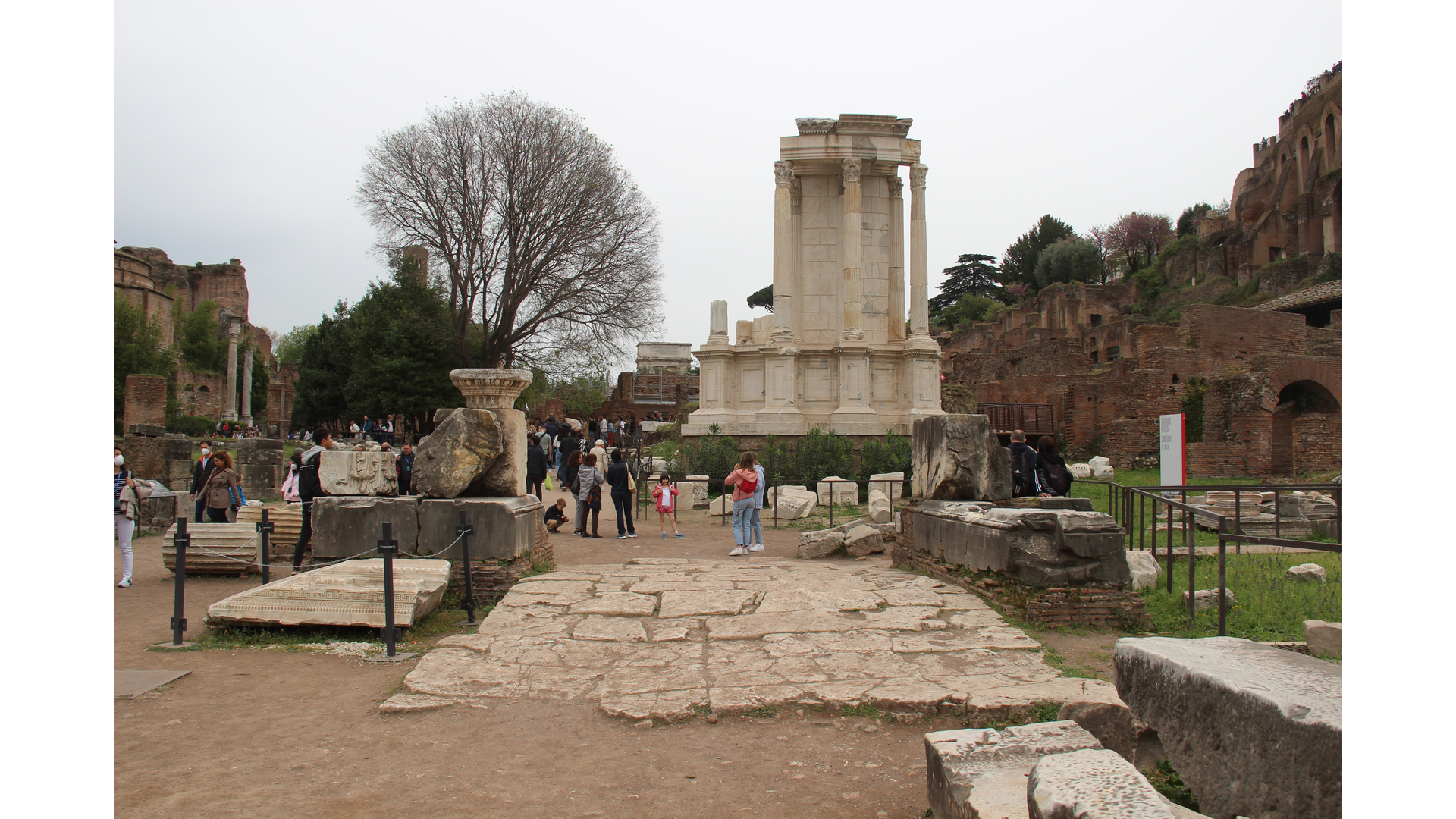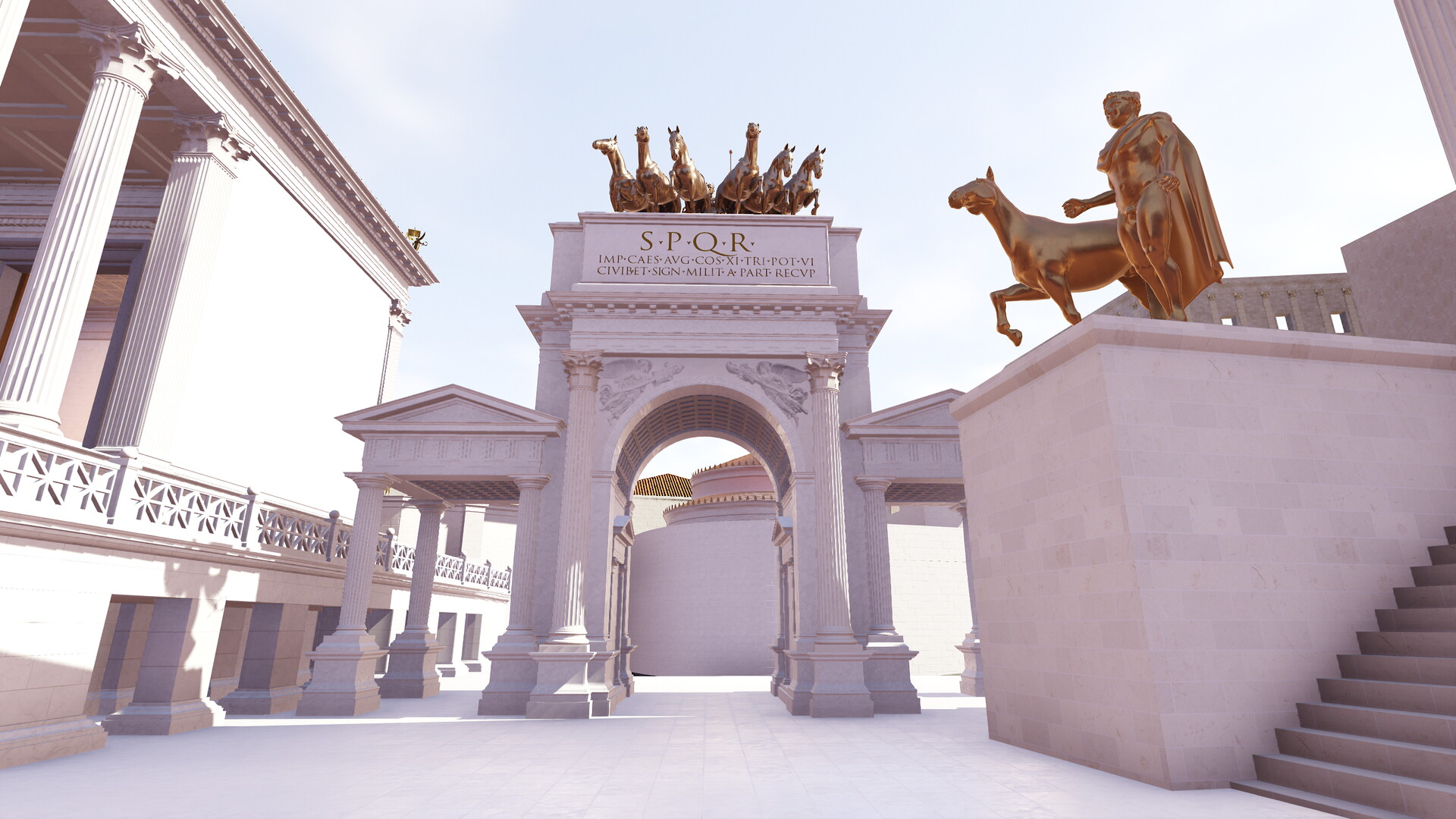 Cet arc à trois baies, situé entre le temple de César divinisé et le temple de Castor et Pollux, a été construit par Auguste après sa victoire sur Antoine et Cléopâtre à Actium. Les restes archéologiques sont maigres mais il est encore possible d’en observer quelques-uns sur place, notamment un morceau de chapiteau corinthien appartenant à l’arche centrale, un fragment de colonne cannelée surmontée d’un chapiteau dorique, appartenant à une des deux arches latérales, et enfin un fragment de frise. Cet arc met essentiellement en avant les qualités militaires d’Auguste. Il exalte la victoire de l’Empire sur une nation aussi riche et prestigieuse que l’Egypte. Peut-être fut-il rapidement transformé ou même reconstruit pour célébrer la victoire d’Auguste contre les Parthes. C’est un sujet délicat qui suscite de multiples discussions entre les spécialistes.