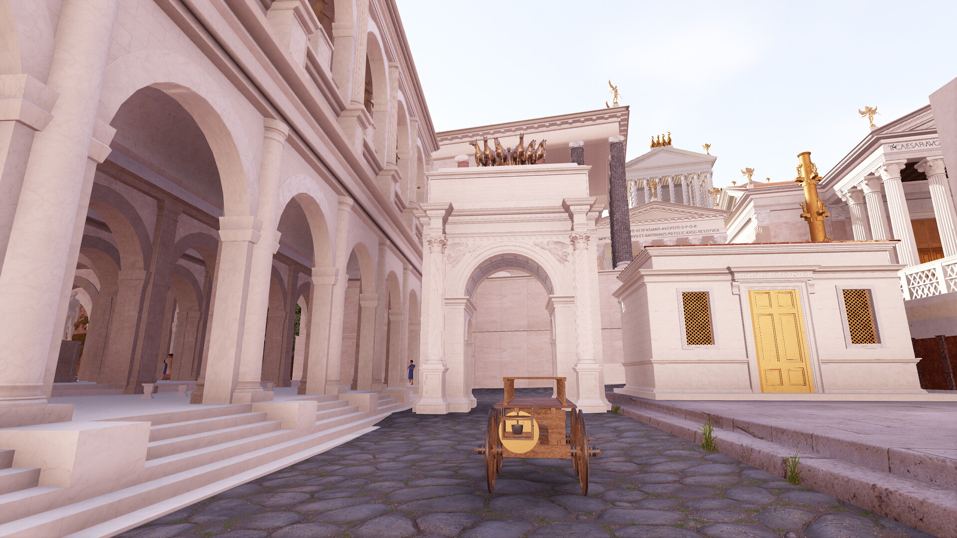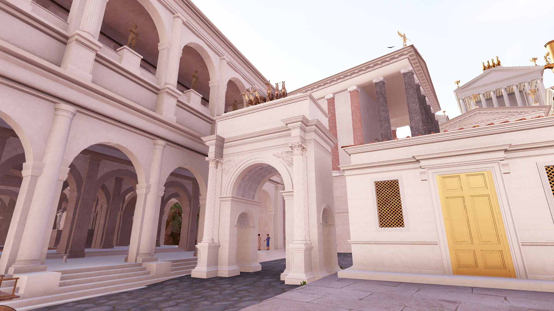 Arc de Tibère sur le forum romain : Image de restitution virtuelle.L’arc de Tibère sur la uia noua. A gauche, la basilique julienne, à droite, la schola de Xanthos. - (Documentation : Ph. Fleury et S. Madeleine – Infographie : C. Morineau et N. Lefèvre, 2016)