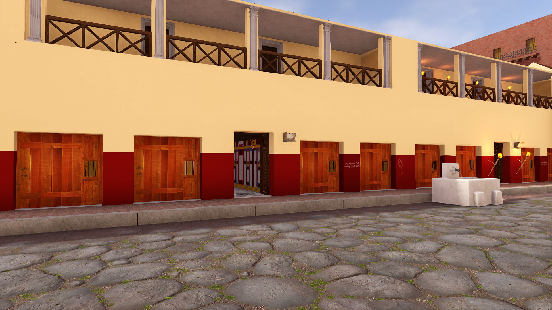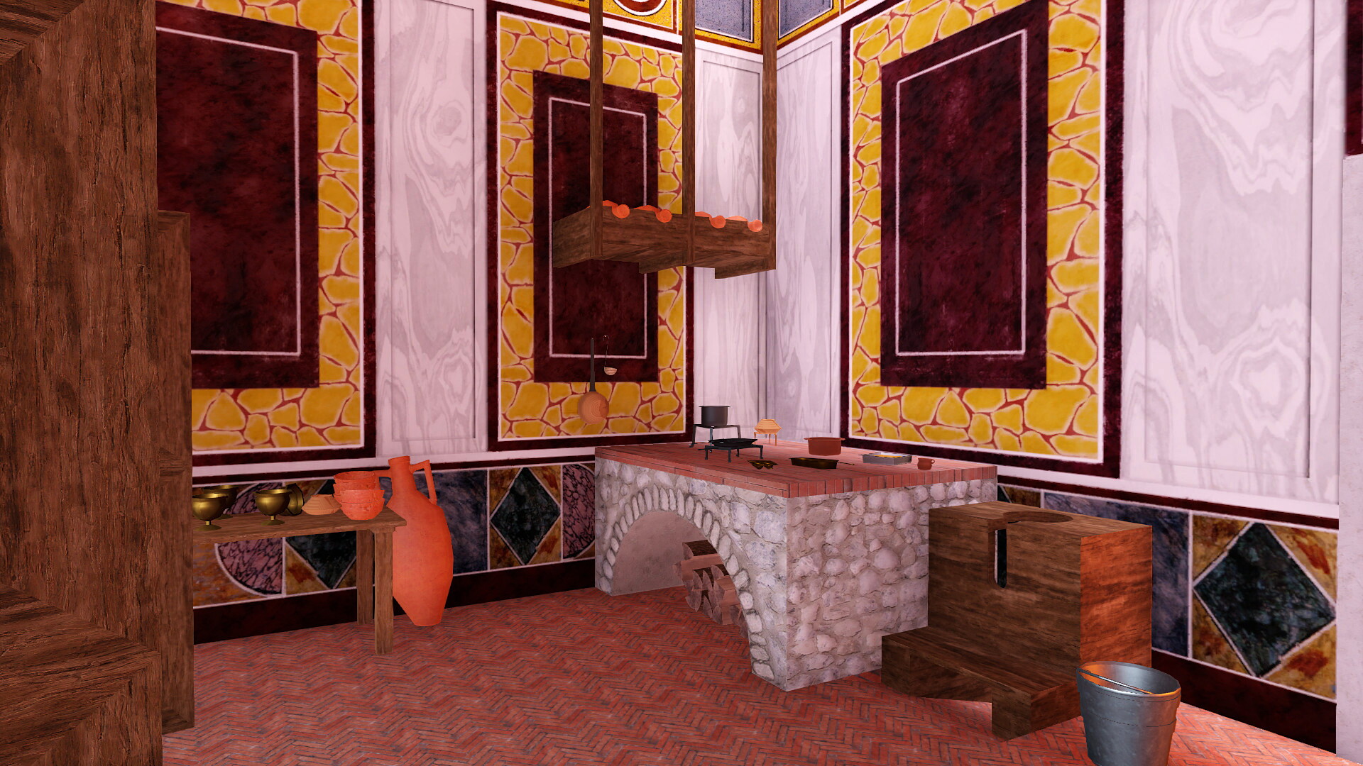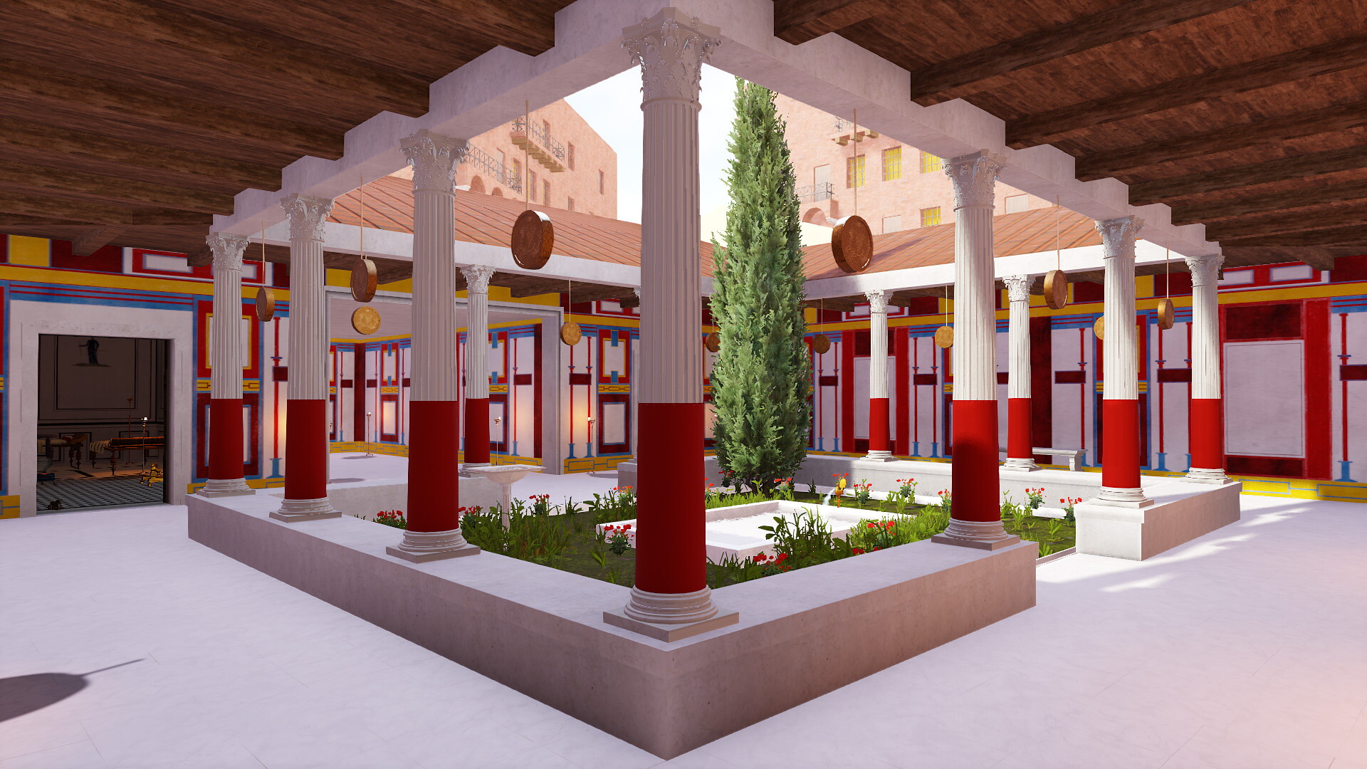 La maison représentée sur cette restitution a été modélisée à partir de domus représentées sur la Forma Vrbis Romae, dans le vicus Patricius (aujourd’hui via Urbana). Elle a un plan « classique ». De la rue, un vestibule conduit à l’atrium, pièce à ciel ouvert, autour de laquelle s’ordonnent une première série de pièces (chambre à coucher, cuisine…). L’espace laissé ouvert dans le toit s’appelle le compluuium ; en dessous, les eaux sont recueillies dans l’impluuium, généralement en communication avec une citerne souterraine. C’est également là qu’est situé le laraire, petit autel autour duquel se célèbrent les cultes domestiques : celui du Lar familiaris, qui protège la famille (au sens large, y compris les esclaves), celui des Pénates (les divinités du « garde-manger »), celui du Genius : démon personnel du maître de maison. Face au vestibule, au fond de l’atrium, se trouve le tablinum, le « bureau » du maître de maison : on y a parfois trouvé un coffre-fort. Derrière le tablinum commence une deuxième partie de la maison : le péristyle, largement ouvert sur le ciel. Au centre du péristyle il y a un jardin d’agrément souvent orné d’un bassin avec des jets d’eau. Sur le péristyle s’ouvrent des chambres, des salles à manger, des cuisines, des salons (oeci)… La partie romaine de la maison autour de l’atrium sert à la vie publique, à la réception des clients, aux fonctions de représentation ; la partie autour du péristyle à la vie privée. La domus est généralement séparée de la rue par des boutiques sans communication avec la maison. Elle est toute centrée sur l’intérieur. La lumière vient de l’atrium et du péristyle, il n’y a pratiquement pas d’ouverture sur la rue. Il peut y avoir un étage.