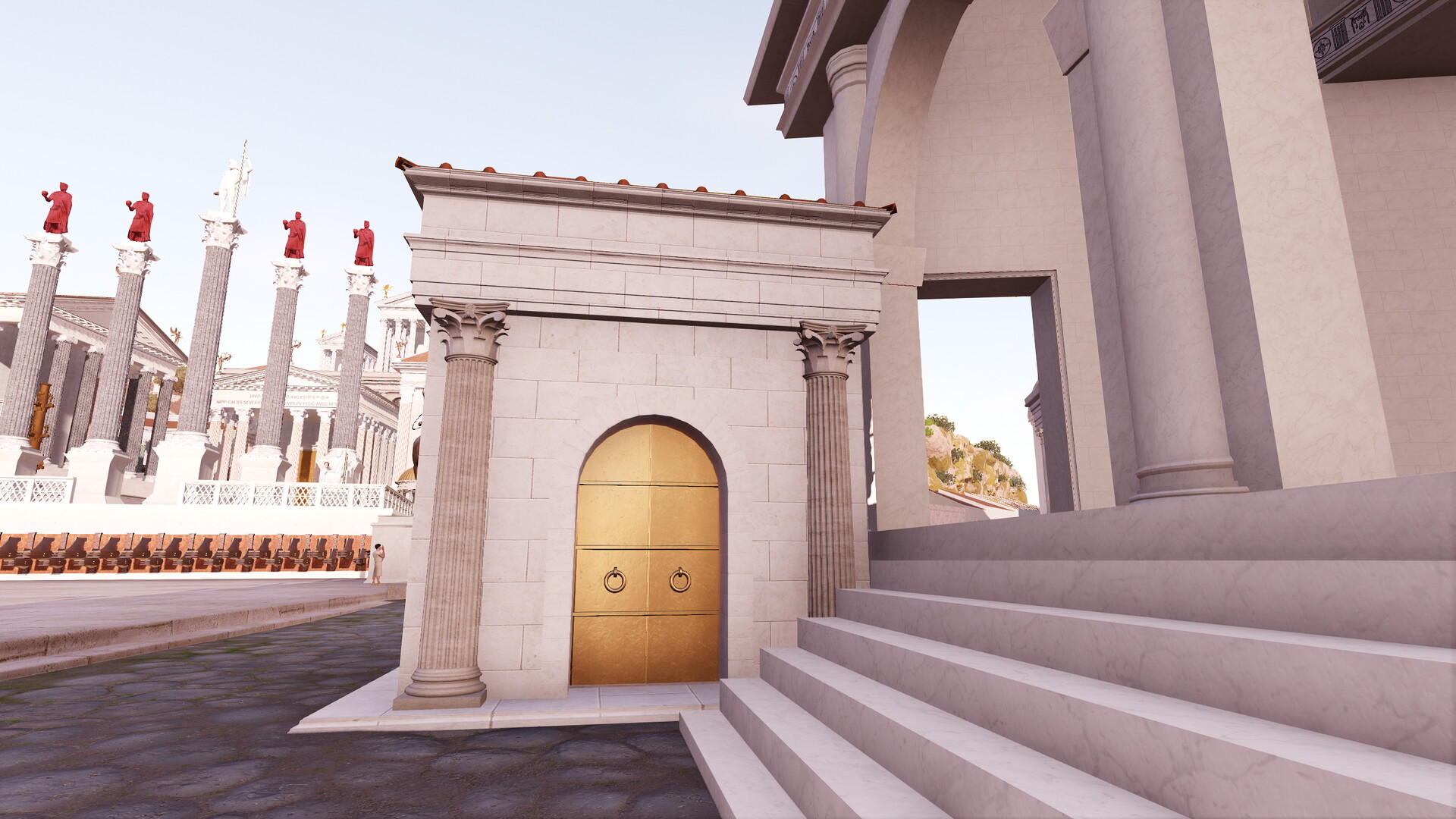 Tous les éléments sont là. On n’apprend tout d’abord que le temple est juste assez grand pour contenir une statue de Janus de 5 coudées, ce qui correspond sensiblement à 2,30 m. Ensuite, Procope nous dit que le temple est en bronze. Il faut probablement comprendre que l’intérieur du temple était couvert de plaques de bronze, ce qui devait donner une sensation de lumière irradiante dès qu’une flamme était allumée au sein de l’espace sacré. Le fait de tapisser ainsi l’intérieur d’un temple était déjà connu dans le monde grec. Pausanias parle par exemple d’un temple d’Athéna à Sparte, qui serait décoré de la même manière (10, 5, 11). L’influence de ce type de décor est probablement à rechercher encore plus loin, vraisemblablement au Proche-Orient.