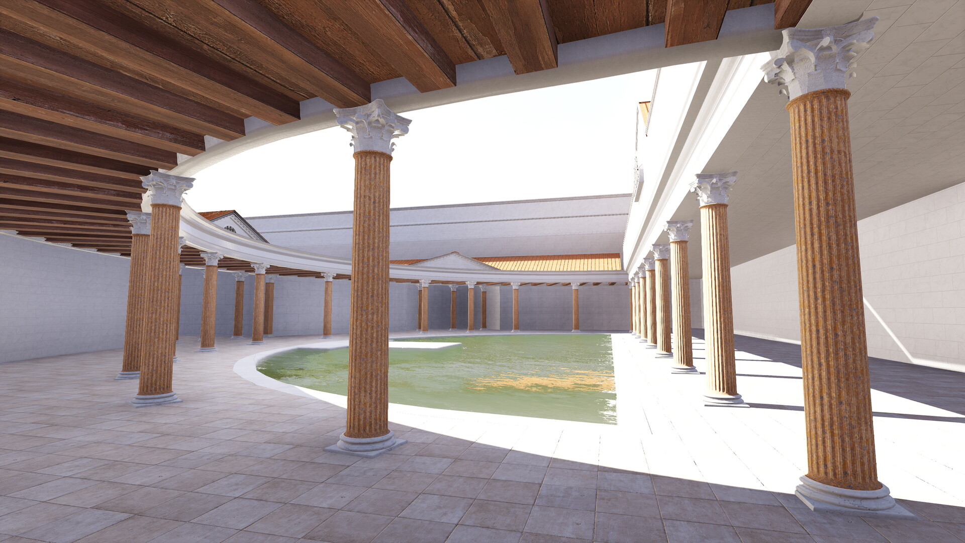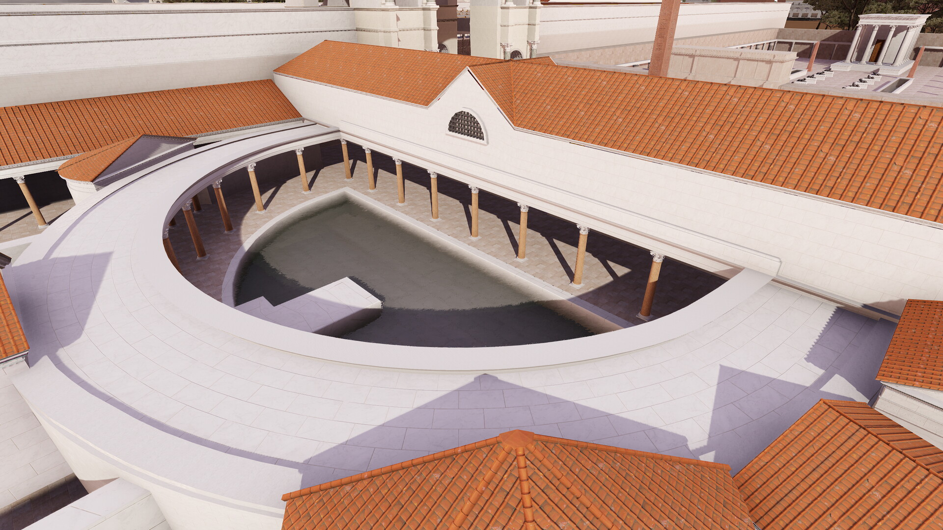 Temple de Sérapis (Champ de Mars) : Image de restitution virtuelle.(Documentation : N. Gautier, Ph. Fleury et S. Madeleine – Infographie : A. Tillier, C. Morineau, N. Lefèvre, 2018)