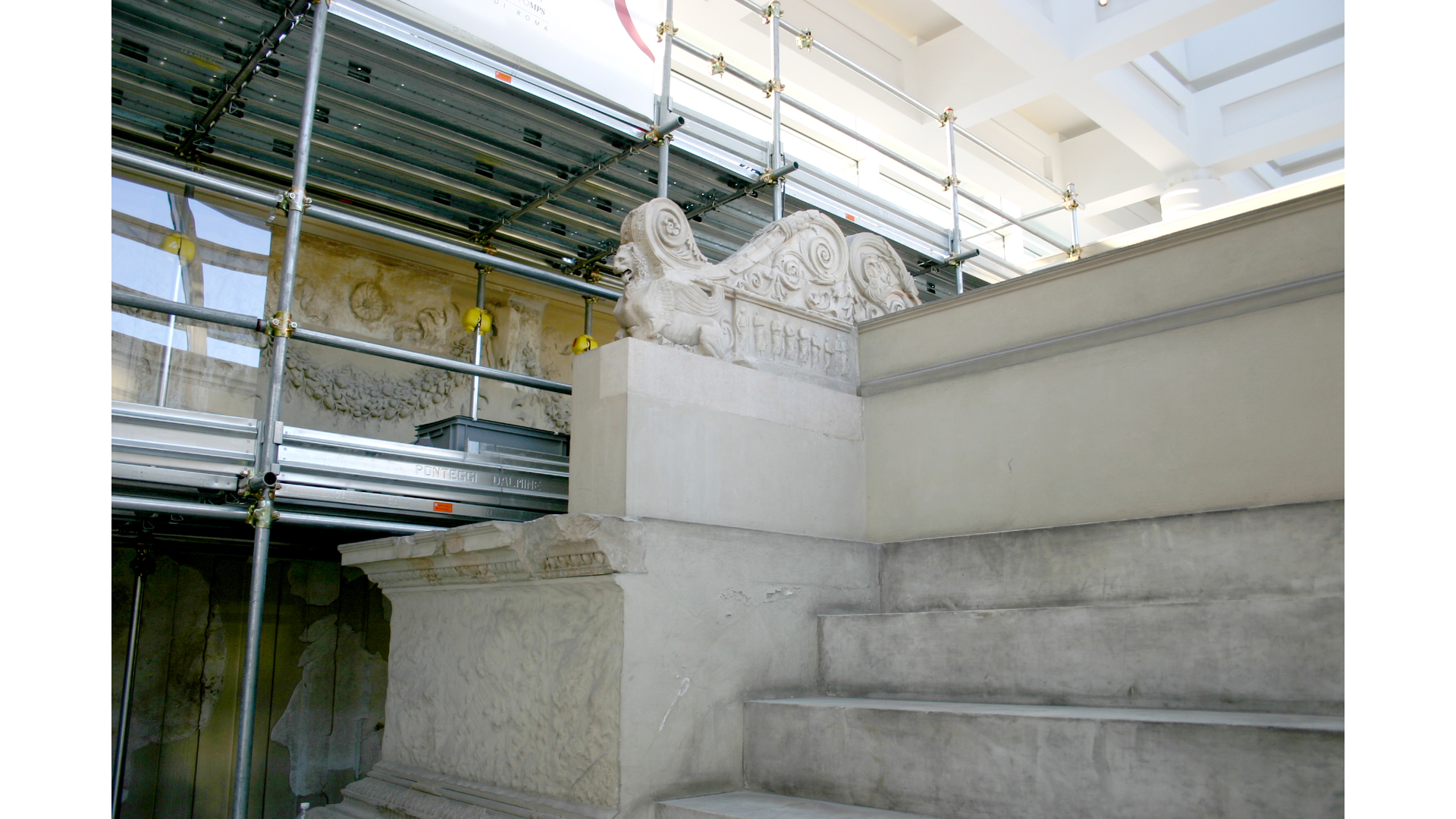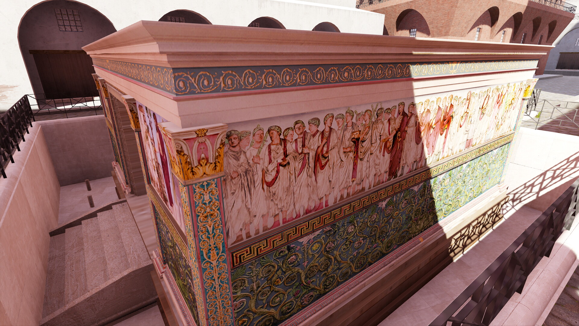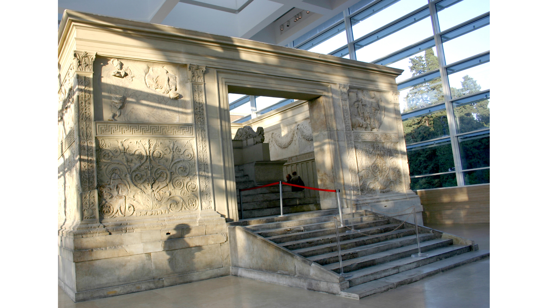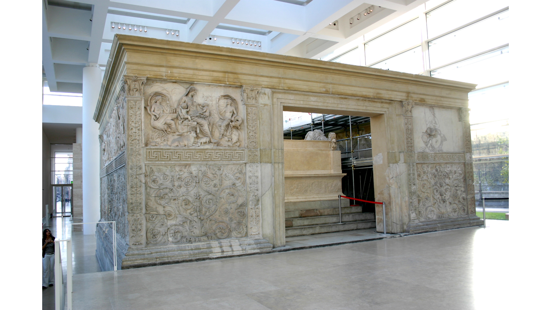 L’autel de la Paix (Ara Pacis) fut érigé sur l’ordre du sénat, en 13 av. J.-C., lors du retour d’Auguste de Gaule. Il se situait à l’origine le long de la voie Flaminia, aujourd’hui via del Corso. Il est abrité aujourd’hui dans un musée situé entre le Tibre et le Mausolée d’Auguste. Dédié à la paix, il fut inauguré en 9 av. J.-C. L’Ara Pacis se compose d’un autel entouré d’une enceinte de marbre rectangulaire mesurant 11,630 m sur les côtés ouest et est qui portent les ouvertures et 10,625 m sur les côtés nord et sud. A l’intérieur, on accédait à l’autel proprement dit par trois marches disposées sur les quatre côtés. Un des côtés possédait cinq marches supplémentaires pour faciliter au prêtre l’accès à la table d’autel. L’Ara Pacis avait deux entrées, larges de 3,60 m, situées sur les longs côtés. L’édifice était richement orné, à l’intérieur comme à l’extérieur, de bas-reliefs. Chaque angle extérieur était garni d’un pilastre de marbre à chapiteau corinthien. A l’intérieur, le soubassement était formé de larges rainures verticales imitant une palissade de bois. Les parois de la partie supérieure étaient agrémentées de festons, de bucranes et de patères.