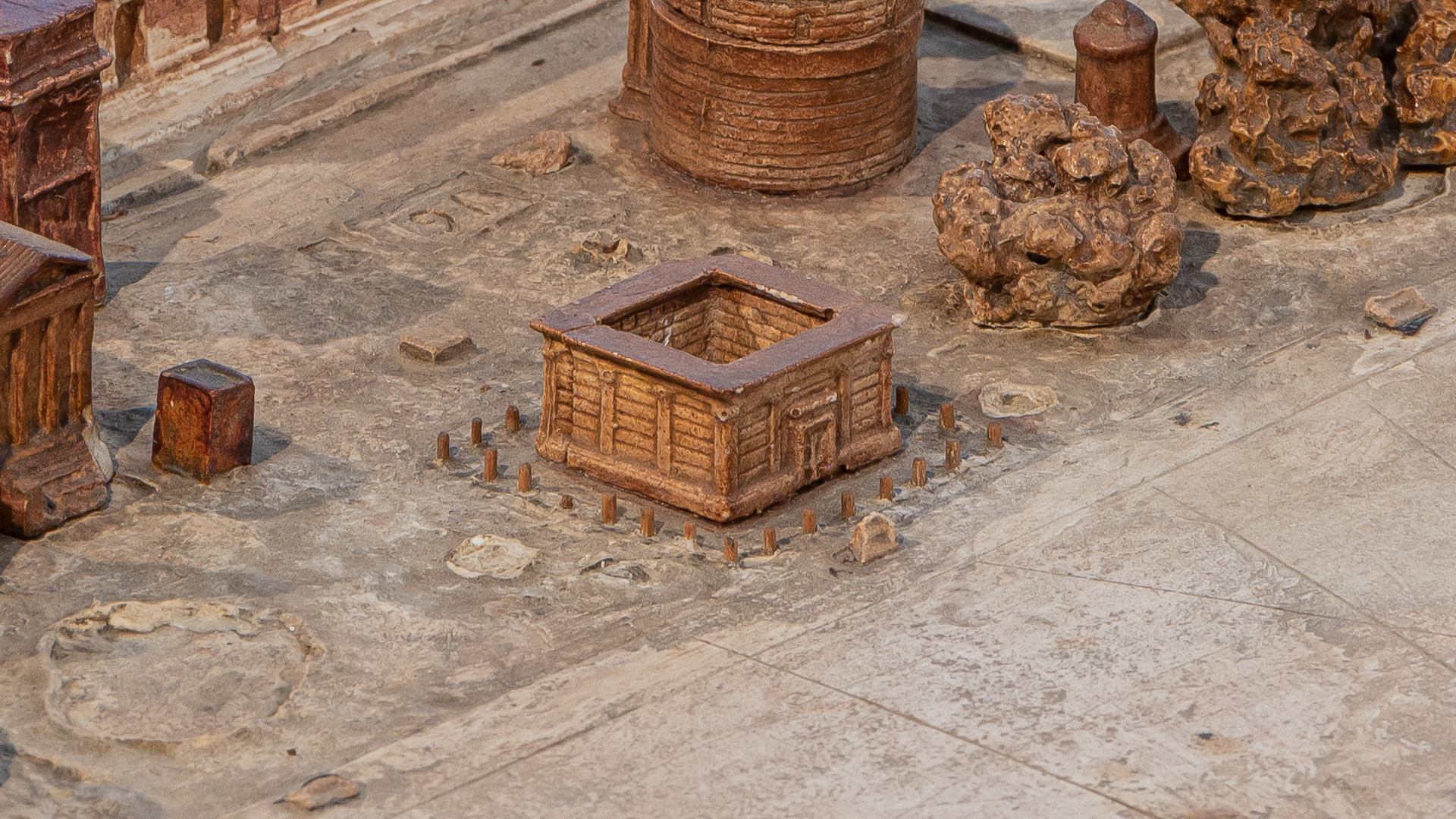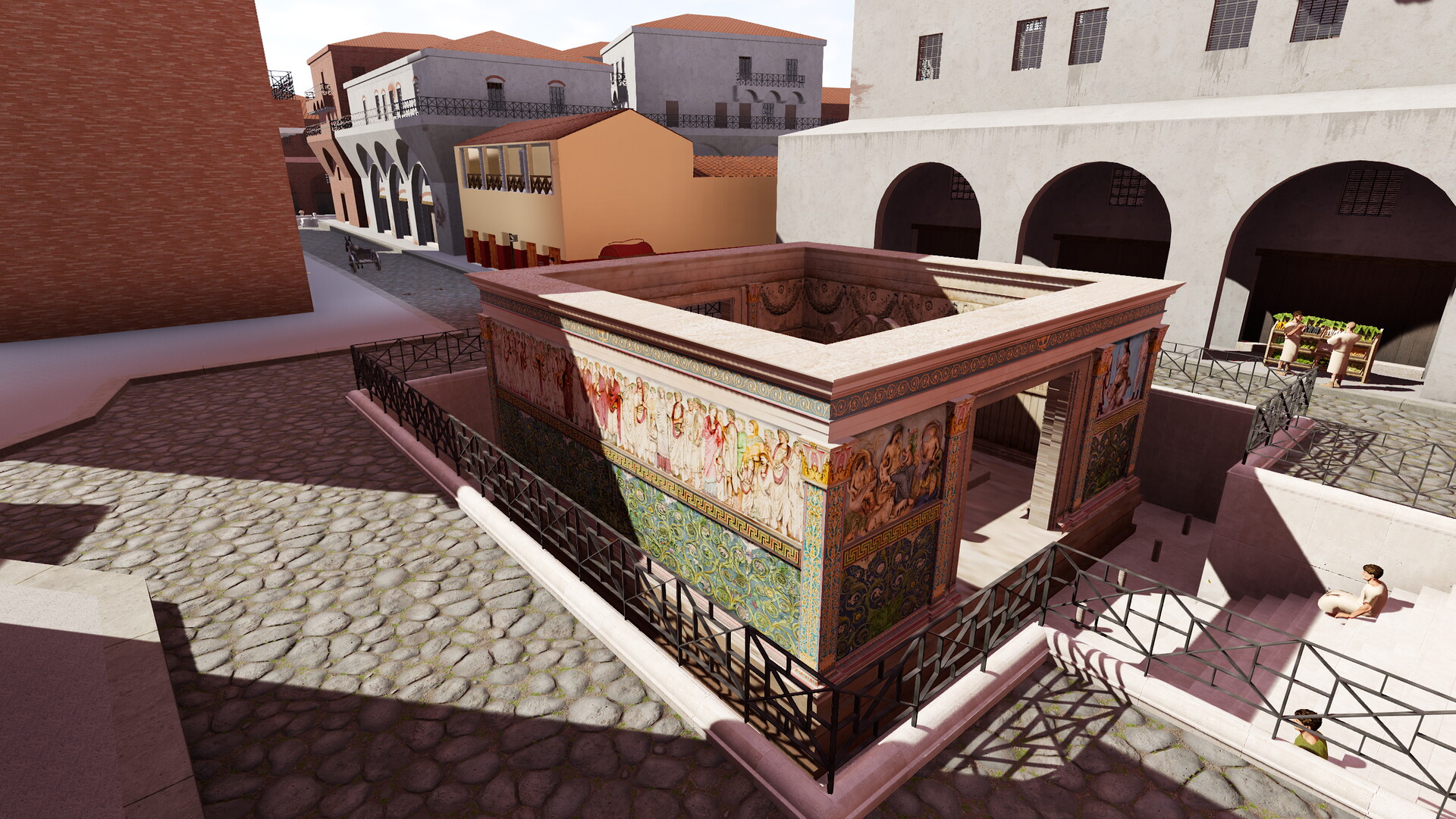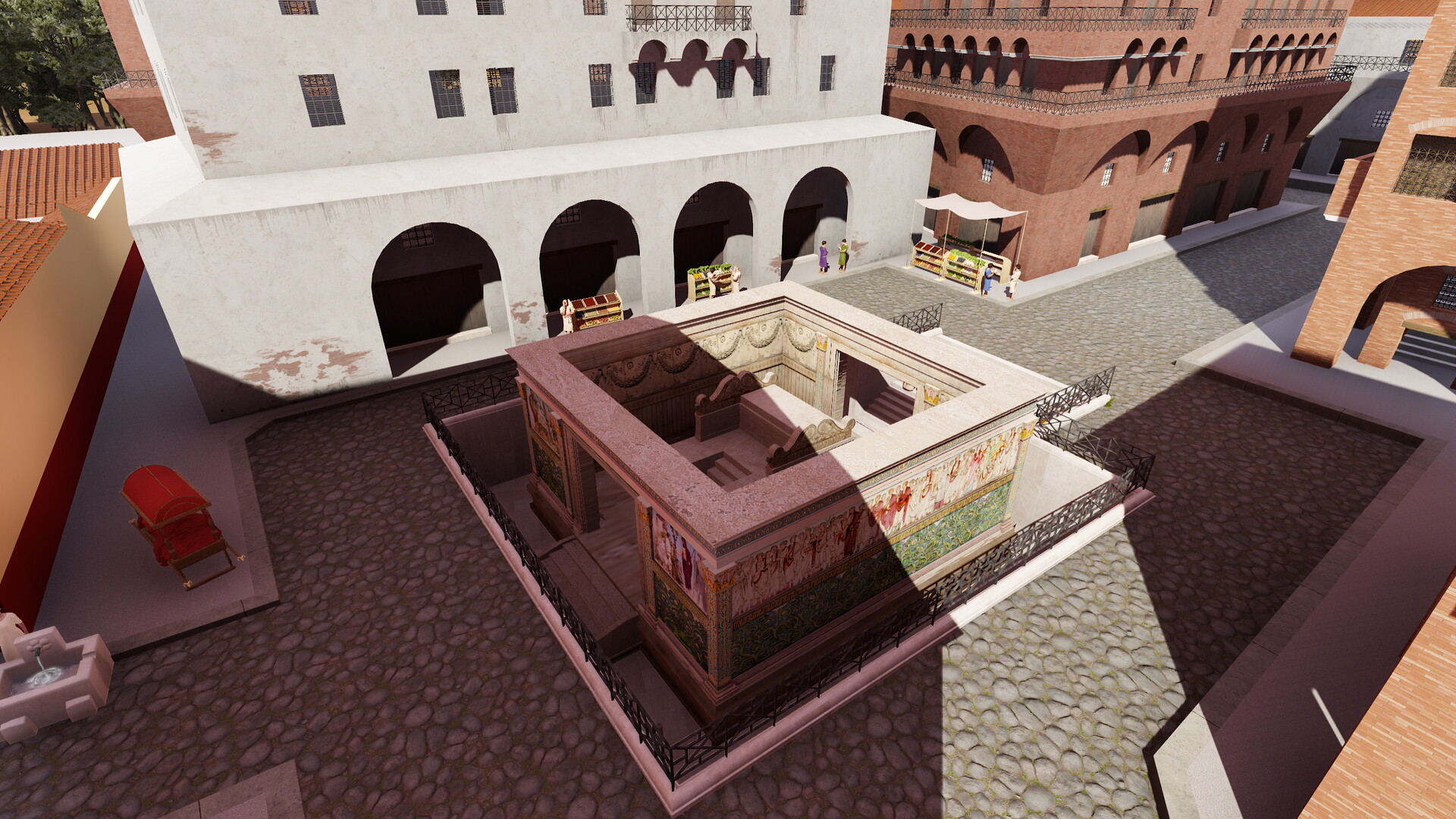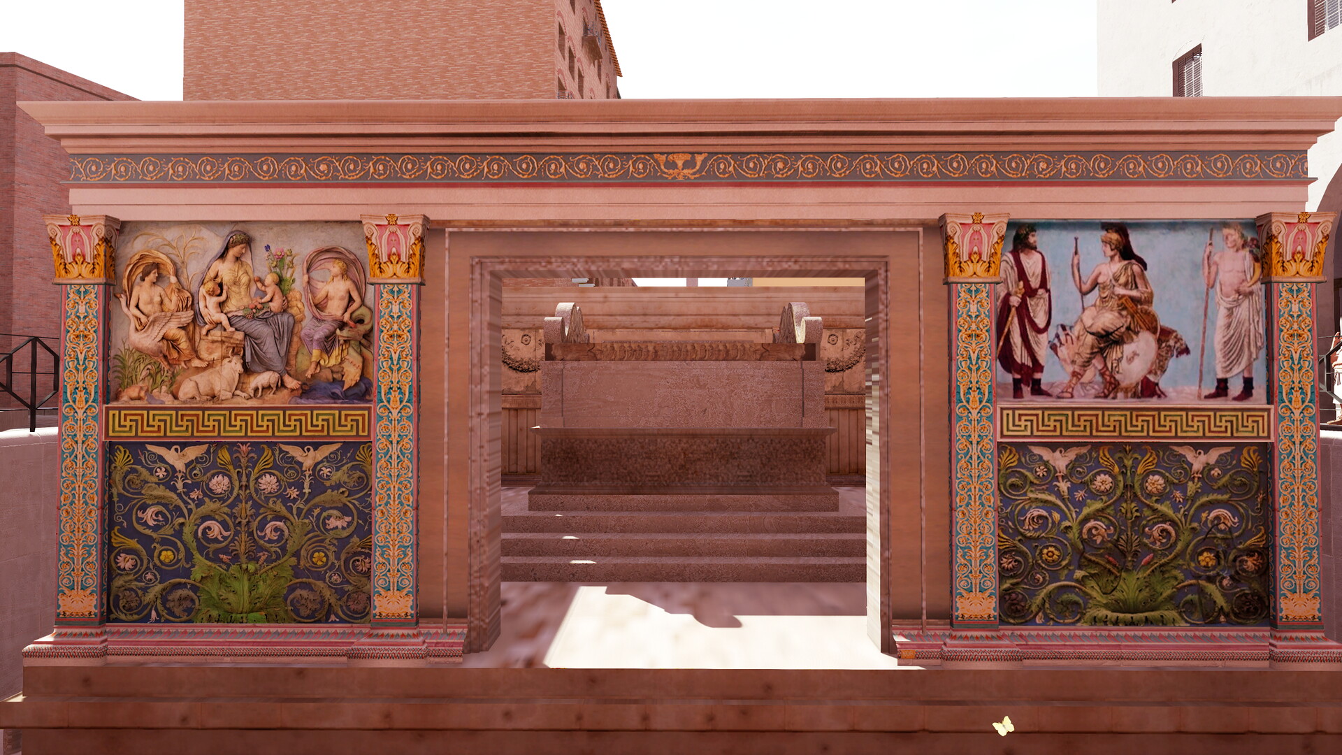 L’autel de la Paix (Ara Pacis) fut érigé sur l’ordre du sénat, en 13 av. J.-C., lors du retour d’Auguste de Gaule. Il se situait à l’origine le long de la voie Flaminia, aujourd’hui via del Corso. Il est abrité aujourd’hui dans un musée situé entre le Tibre et le Mausolée d’Auguste. Dédié à la paix, il fut inauguré en 9 av. J.-C. L’Ara Pacis se compose d’un autel entouré d’une enceinte de marbre rectangulaire mesurant 11,630 m sur les côtés ouest et est qui portent les ouvertures et 10,625 m sur les côtés nord et sud. A l’intérieur, on accédait à l’autel proprement dit par trois marches disposées sur les quatre côtés. Un des côtés possédait cinq marches supplémentaires pour faciliter au prêtre l’accès à la table d’autel. L’Ara Pacis avait deux entrées, larges de 3,60 m, situées sur les longs côtés. L’édifice était richement orné, à l’intérieur comme à l’extérieur, de bas-reliefs. Chaque angle extérieur était garni d’un pilastre de marbre à chapiteau corinthien. A l’intérieur, le soubassement était formé de larges rainures verticales imitant une palissade de bois. Les parois de la partie supérieure étaient agrémentées de festons, de bucranes et de patères.