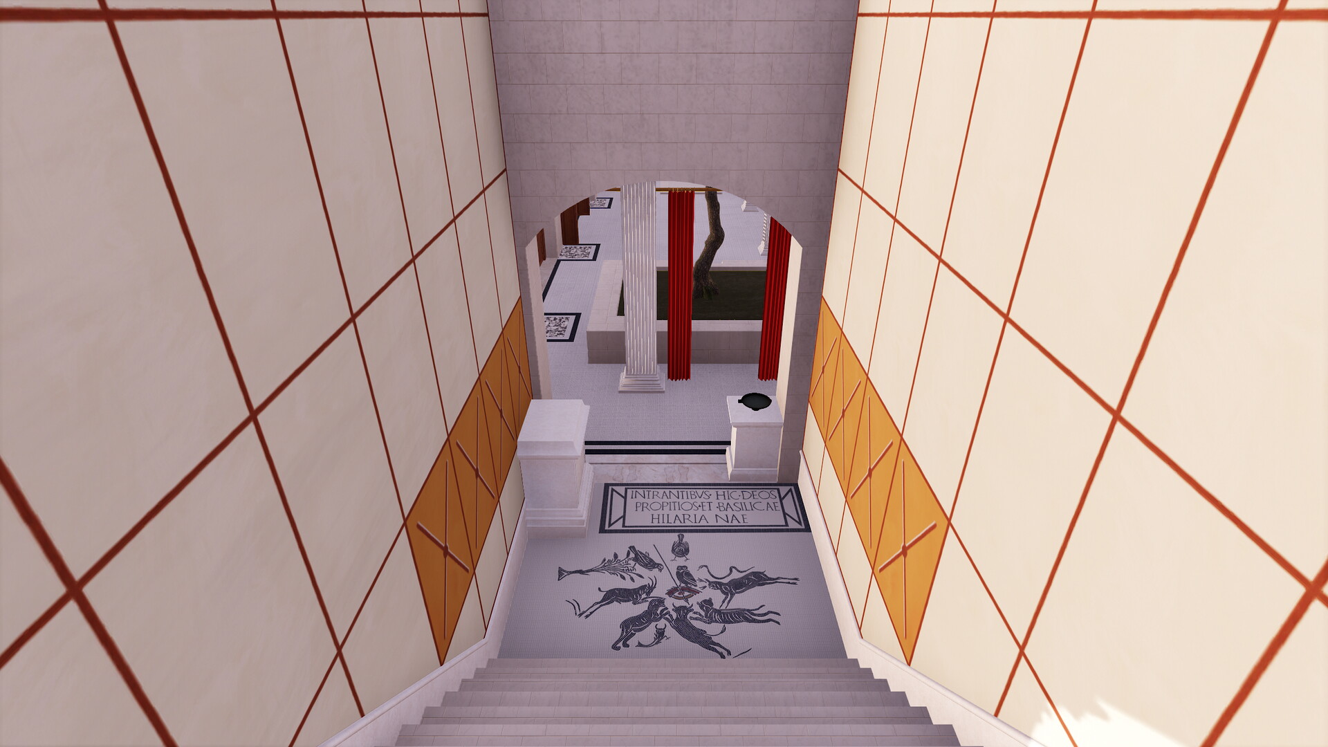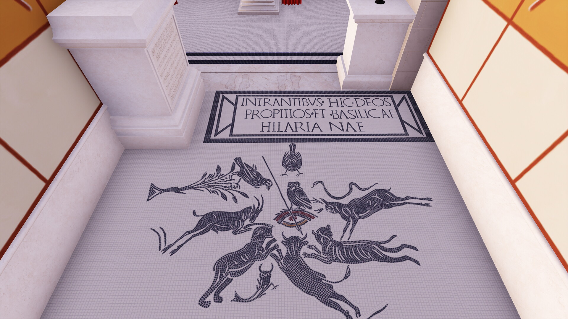 La Basilica Hilariana est un édifice collégial situé sur la colline du Caelius. Cette basilique, identifiée par une inscription sur le sol de son vestibule, a pris le nom de son constructeur : Hilarus, un marchand de perles. La base d’une statue dédiée à ce personnage a été retrouvée sur place. Curieusement, ce nom rappelle les Hilaria, fêtes en l’honneur de Cybèle, culte auquel la basilique était liée. Le bâtiment de dimension modeste est semi enterré : il faut descendre douze marches pour pouvoir accéder au vestibule puis à une cour à ciel ouvert. De part et d’autre de cet espace s’ouvre une série de pièces aux plafonds voûtés. L’étage est accessible par un second escalier parallèle au premier.