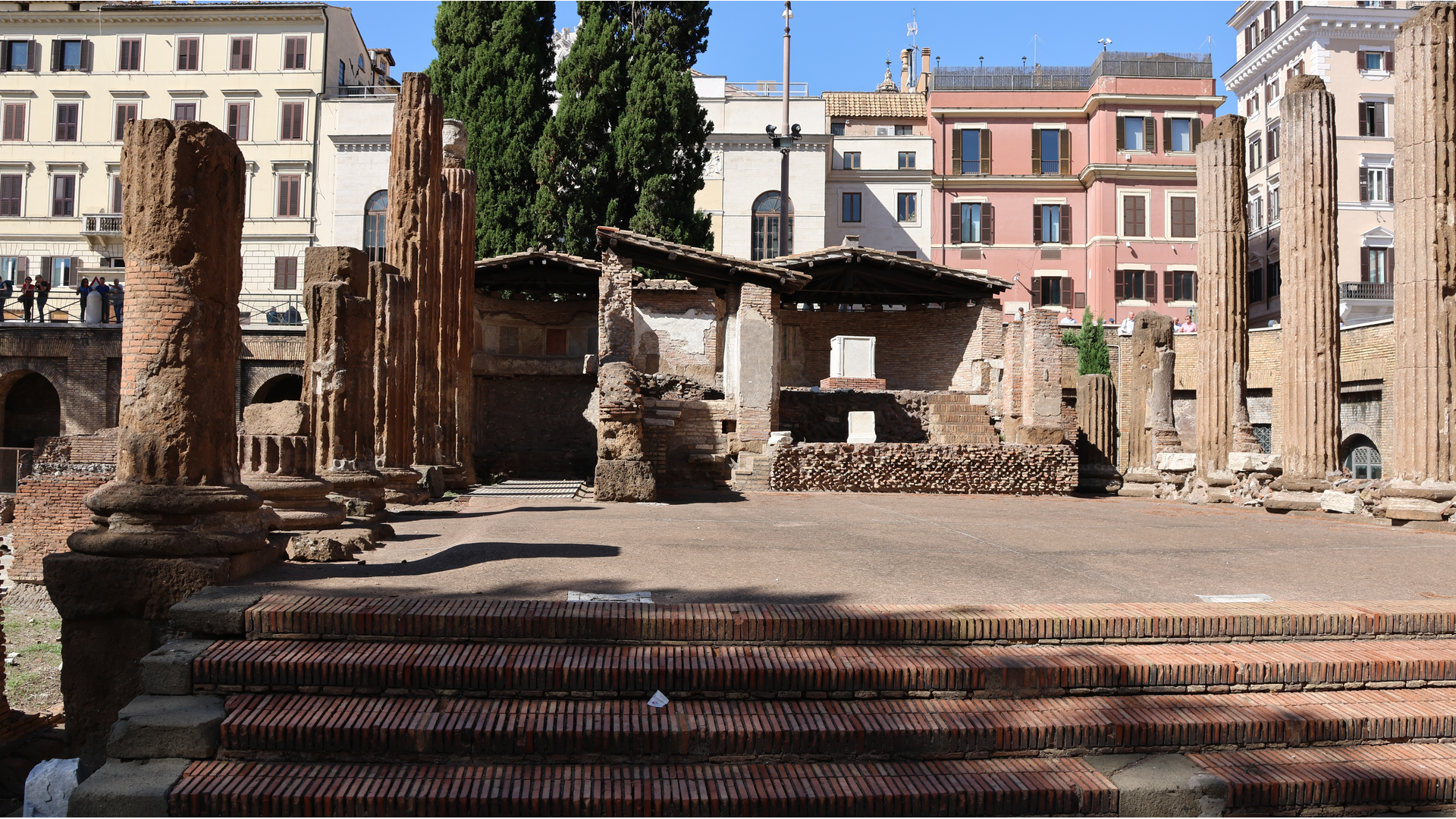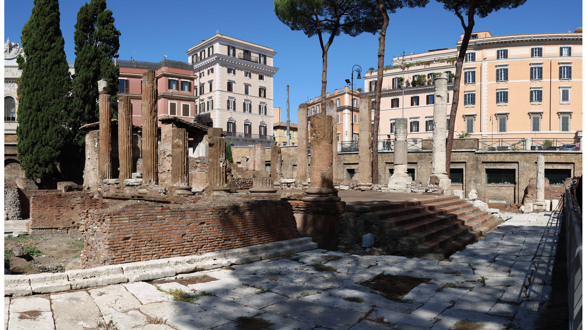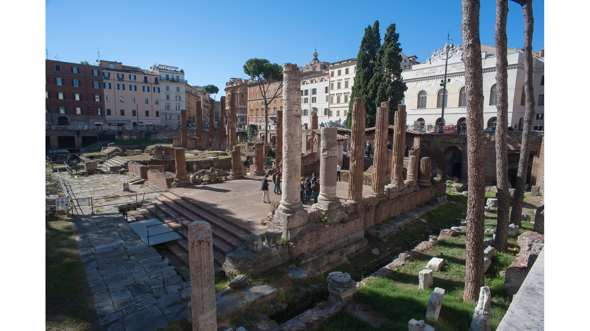 L’espace appelé aujourd’hui « Zone sacrée du Largo Argentina » était entouré dans l’Antiquité par un portique et il comprenait quatre temples d’époque républicaine, qui sont désignés conventionnellement avec les quatre premières lettres de l’alphabet. Les chercheurs s’accordent maintenant sur les divinités auxquelles ces temples étaient voués : le Temple A est celui de Juturne, le B celui de la Fortune de ce jour, le C est dédié à Feronia et le D aux Lares Permarini. Cette aire a été considérablement remaniée au cours des âges, ce qui a entraîné des modifications successives de son niveau de sol. D’un point de vue historique, cet ensemble a une connotation particulière car il est attenant à la curie de Pompée, dont le mur du fond se trouve entre les temples B et C, et dans laquelle Jules César a été assassiné aux ides de mars 44, lors d’une séance du Sénat.