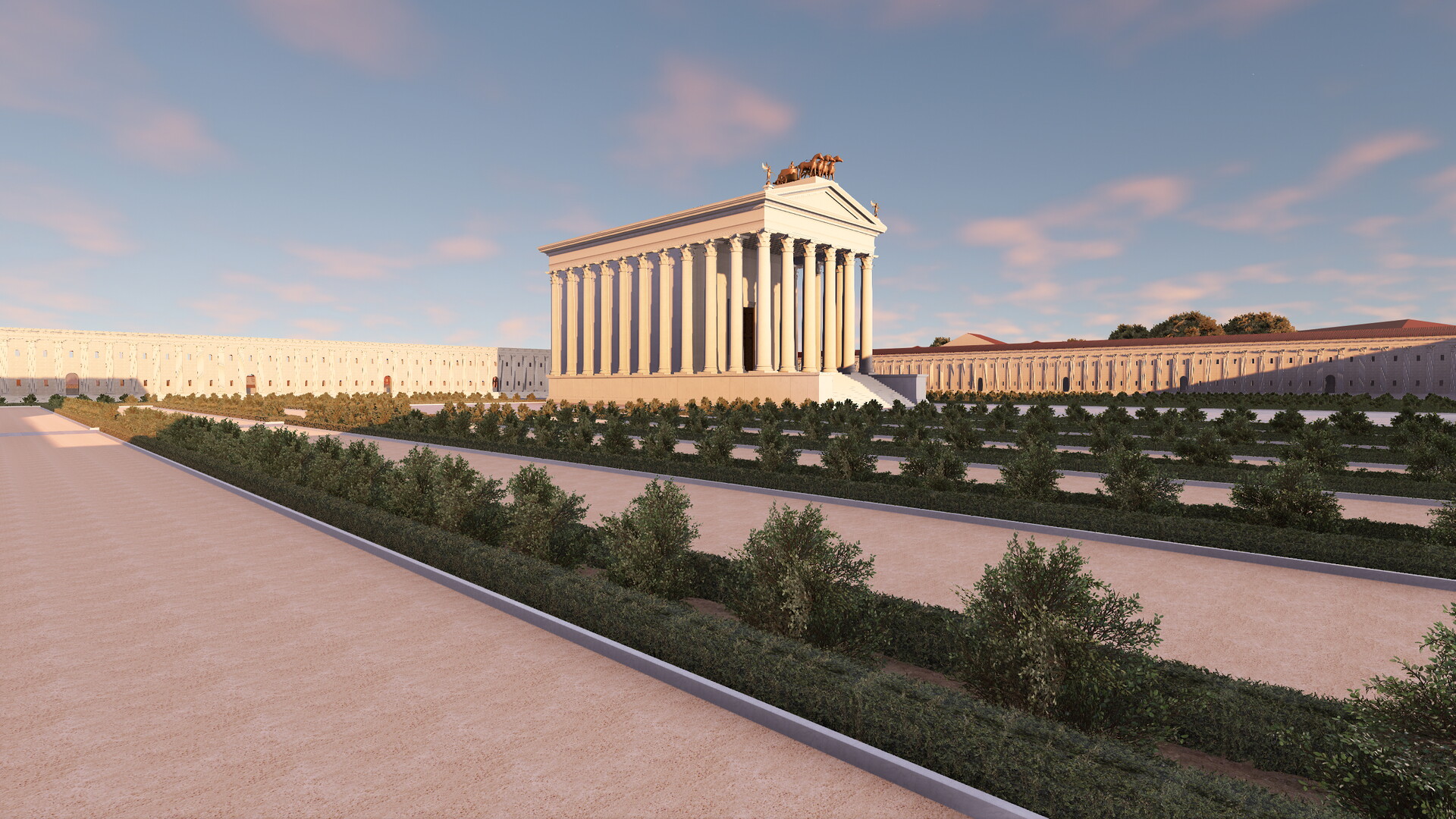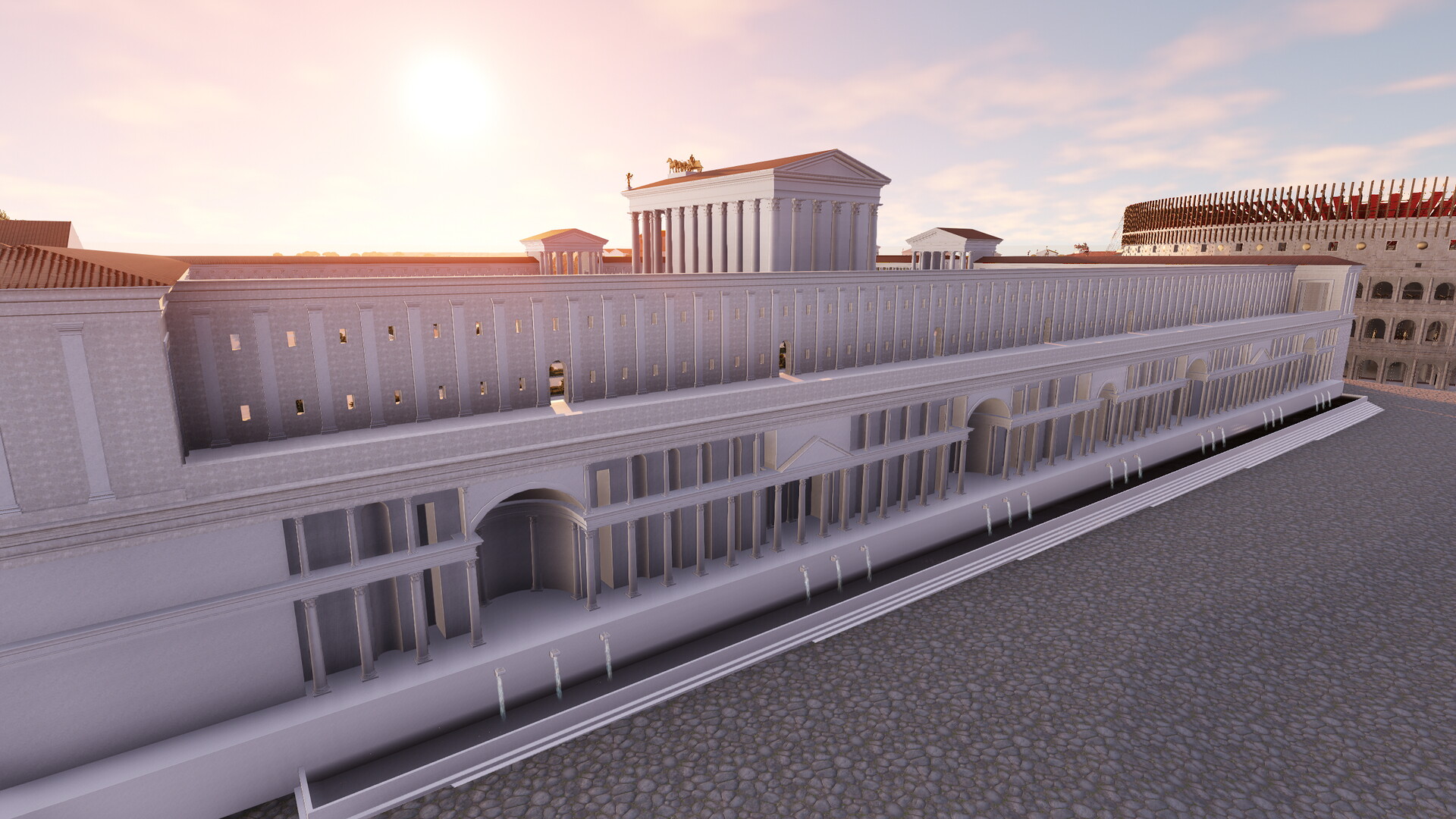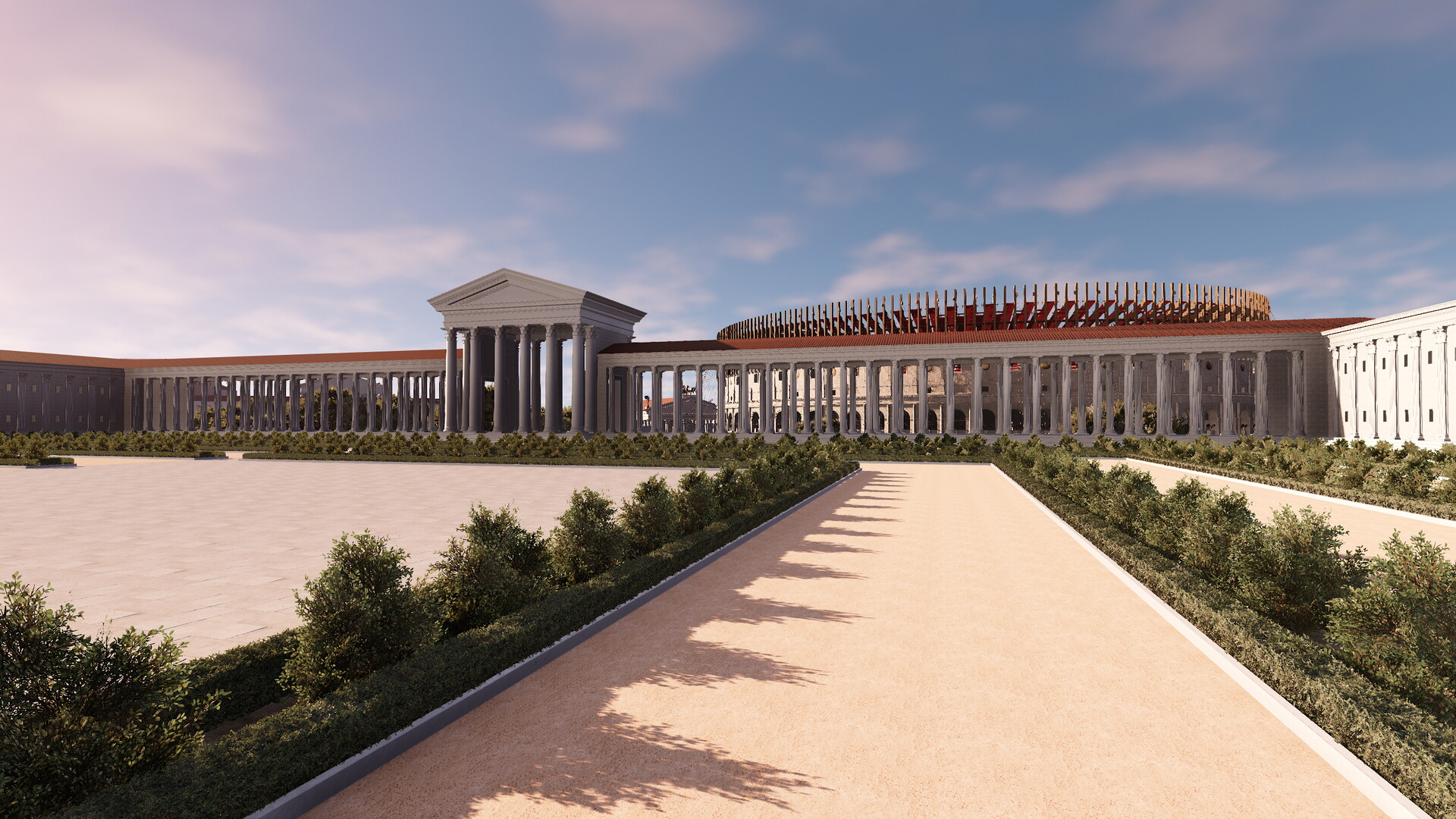Le complexe était constitué d’une vaste terrasse de 180 m sur 200 m maintenue par de puissants murs de soutènement. On peut encore les apercevoir aujourd’hui en face du Colisée (où une citerne est préservée) et le long de la via Claudia (où se dresse le nymphée). Une partie des arcades occidentales ainsi que l’angle Sud-Ouest sont également visibles sous le monastère et sous le campanile de la basilique des Saints Giovanni e Paolo. La terrasse supérieure du sanctuaire, construite sur une colline artificielle, accueillait des jardins et le temple prostyle hexastyle dédié à la divinité impériale. Nous pouvons noter une différence de l’orientation du temple et des jardins entre la maquette de Paul Bigot et le modèle virtuel. Cet écart s’explique par l’avancée des recherches sur ce secteur. En effet, le temple de Claude et plus largement la colline du Caelius ont fait l’objet d’une étude fondamentale publiée en 1944 par A.M. Colini. Cet architecte italien a réussi à déterminer grâce à la Forma Vrbis Romae que le temple de Claude n’était pas orienté vers le Sud – comme on le pensait au XIXe siècle et à l’époque de Paul Bigot – mais vers l’Ouest. Le modèle virtuel a donc permis de rectifier cette erreur. La Forma Vrbis constitue la seule source pour restituer la terrasse puisque, depuis le Moyen-Age, les jardins du monastère des Santi Giovanni e Paolo occupent l’ensemble de la plateforme.