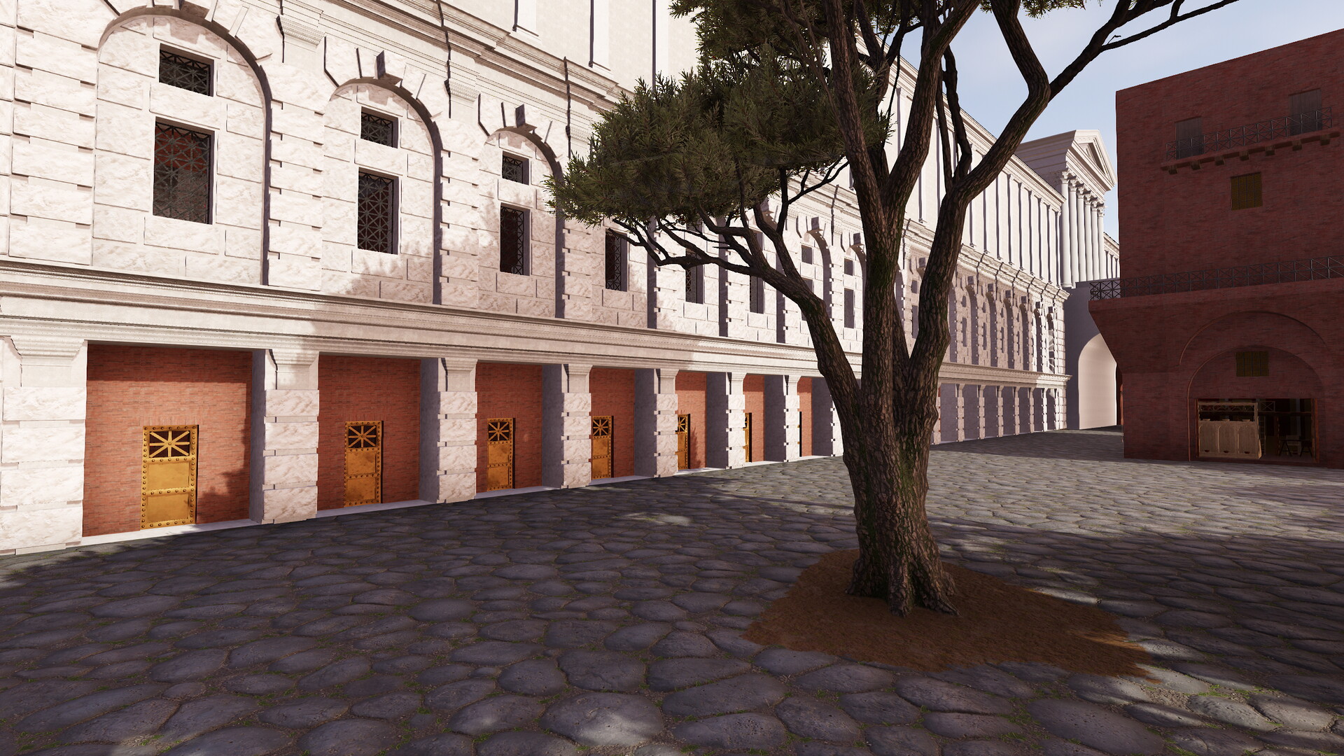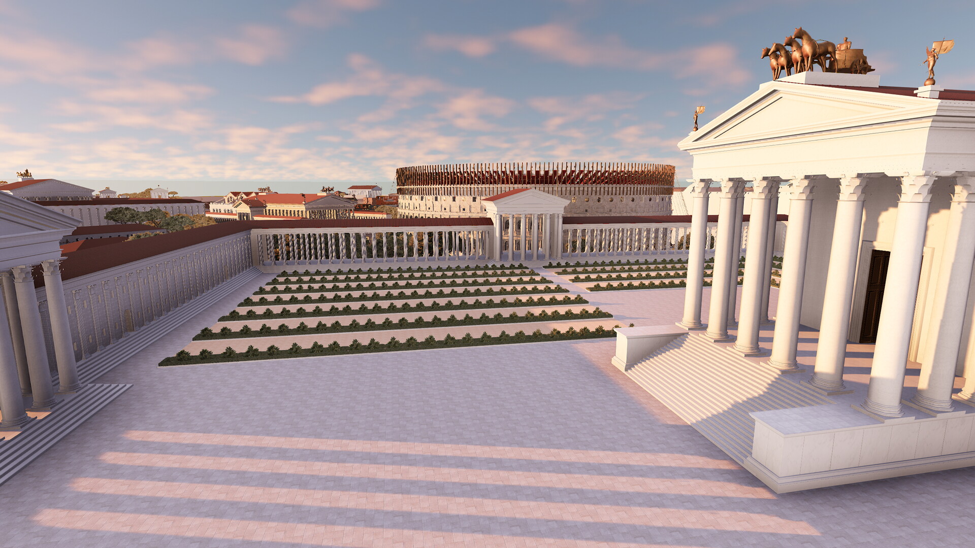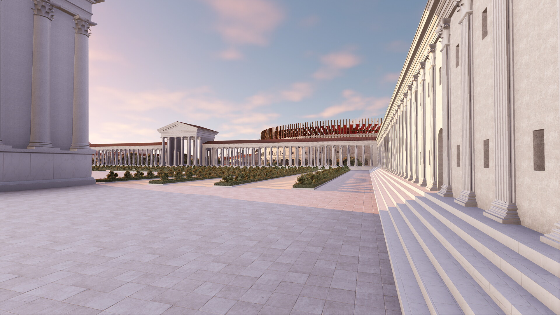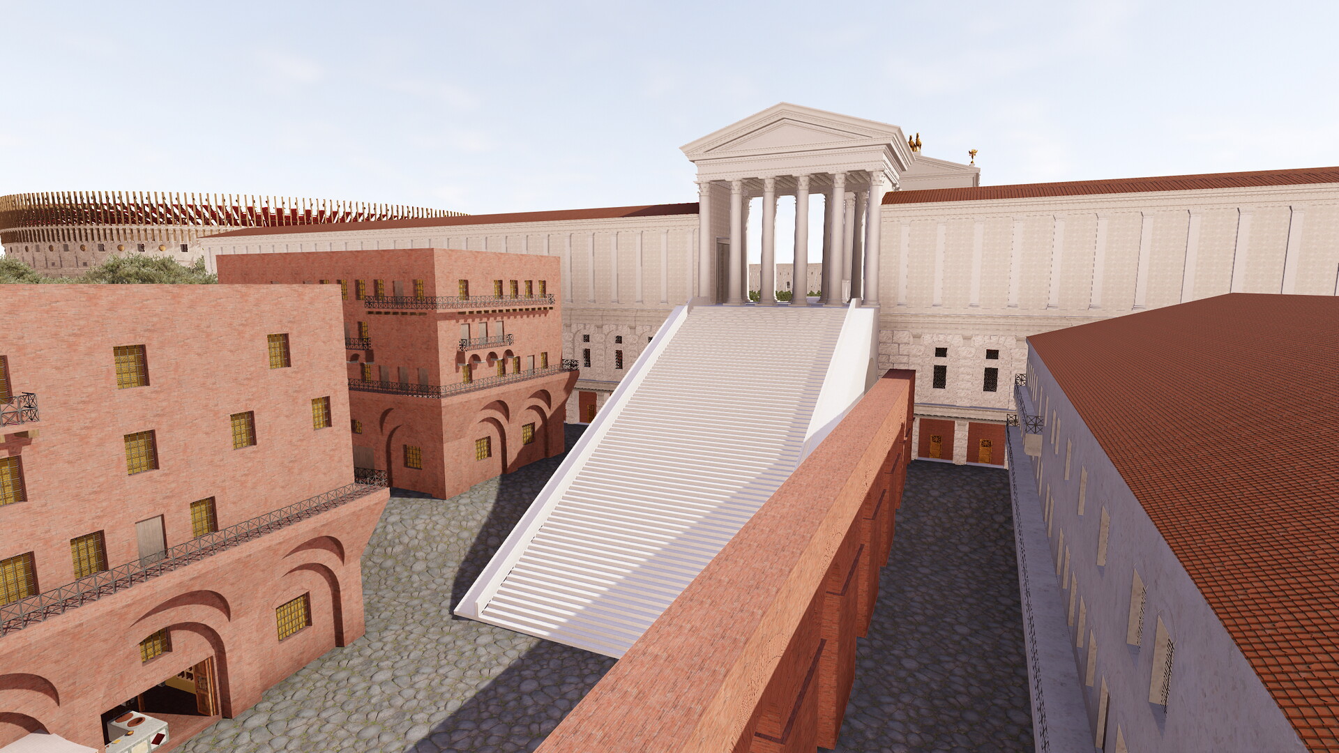 Le complexe était constitué d’une vaste terrasse de 180 m sur 200 m maintenue par de puissants murs de soutènement. On peut encore les apercevoir aujourd’hui en face du Colisée (où une citerne est préservée) et le long de la via Claudia (où se dresse le nymphée). Une partie des arcades occidentales ainsi que l’angle Sud-Ouest sont également visibles sous le monastère et sous le campanile de la basilique des Saints Giovanni e Paolo. La terrasse supérieure du sanctuaire, construite sur une colline artificielle, accueillait des jardins et le temple prostyle hexastyle dédié à la divinité impériale. Nous pouvons noter une différence de l’orientation du temple et des jardins entre la maquette de Paul Bigot et le modèle virtuel. Cet écart s’explique par l’avancée des recherches sur ce secteur. En effet, le temple de Claude et plus largement la colline du Caelius ont fait l’objet d’une étude fondamentale publiée en 1944 par A.M. Colini. Cet architecte italien a réussi à déterminer grâce à la Forma Vrbis Romae que le temple de Claude n’était pas orienté vers le Sud – comme on le pensait au XIXe siècle et à l’époque de Paul Bigot – mais vers l’Ouest. Le modèle virtuel a donc permis de rectifier cette erreur. La Forma Vrbis constitue la seule source pour restituer la terrasse puisque, depuis le Moyen-Age, les jardins du monastère des Santi Giovanni e Paolo occupent l’ensemble de la plateforme.