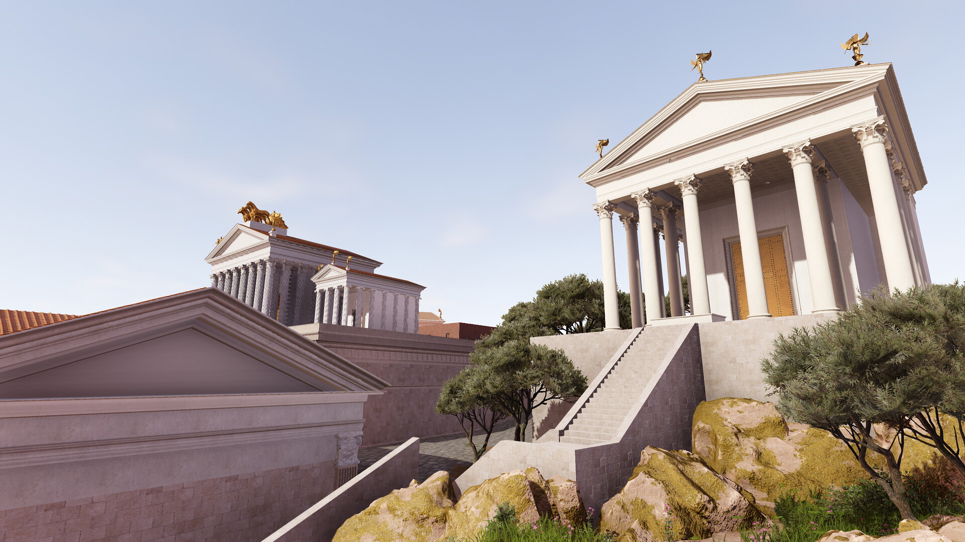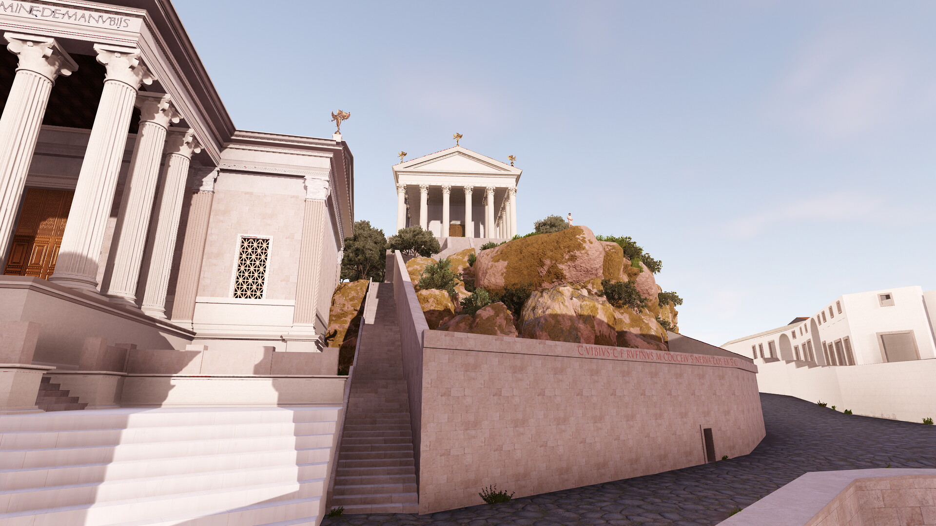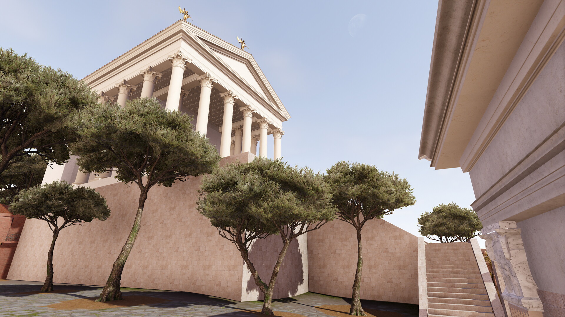 Temple de Junon Moneta (Capitole) : Image de restitution virtuelle.(Documentation : Ph. Fleury, N. Gautier et S. Madeleine – Infographie : C. Morineau et N. Lefèvre, 2020)