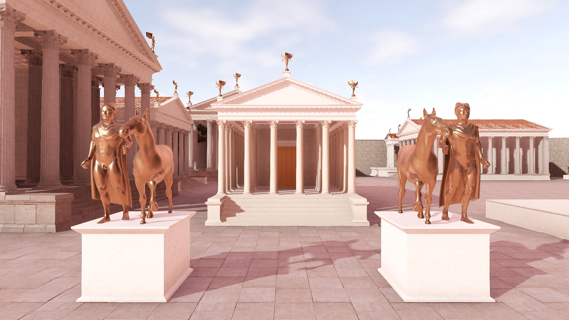 Pour renforcer ce témoignage, Cassius Dion nous dit que Jupiter Tonnant est placé en sentinelle devant le temple de Jupiter capitolin (D.C. 54.4.2-6). Or, juste devant le temple de Jupiter, Junon et Minerve, les substructions d’un temple ont effectivement été mises au jour entre 2009 et 2014 et les fouilles ont montré que deux bases se trouvaient devant le podium. F. Coarelli a brillamment rapproché cette découverte du témoignage de Pline l’ancien (Nat. 34, 78), qui raconte que les Dioscures, les jumeaux Castor et Pollux, étaient représentés devant le temple de Jupiter Tonnant (Coarelli F., « La découverte du Temple de Jupiter Tonans dans l’Area Capitolina », dans Fleury P. et Madeleine S. (éds.), Topographie et urbanisme de la Rome antique. Actes du colloque international de Caen, 11-13 décembre 2019, Caen, Presses Universitaires de Caen, 2022). Pline nous parle de Castor ac Pollux ante aedem Iovis Tonantis, de « Castor et Pollux, devant le temple de Jupiter Tonnant ». Il y a donc de fortes probabilités pour que ce temple mis au jour récemment soit bien celui de Jupiter Tonnant et, dans la maquette virtuelle, deux statues de Castor et Pollux sont placées devant son podium.