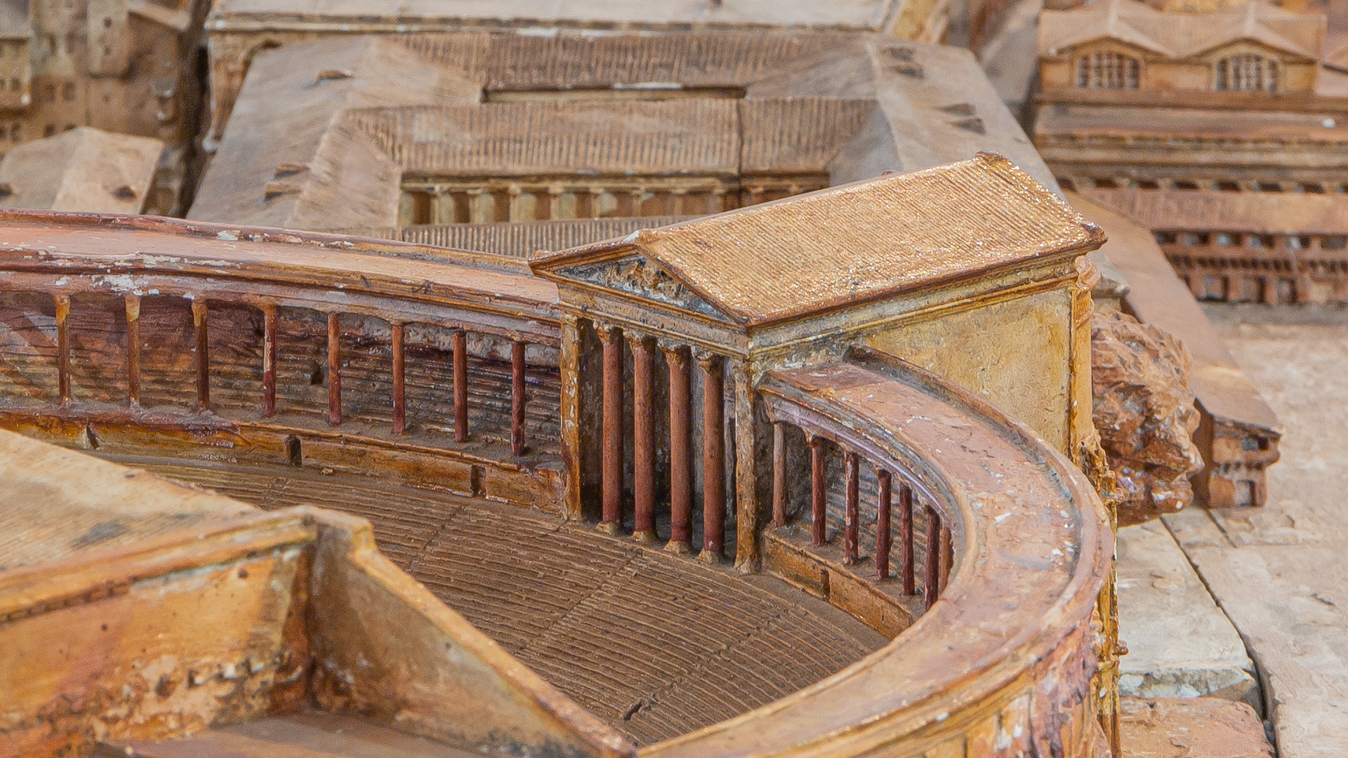Tiron parle lui aussi d’un « temple de la victoire dont les marches étaient à la place du théâtre » (Tiro., Gram. Fgmt. 7, 102). L’intégration d’une structure religieuse dans un théâtre (ou de gradins au pied d’une structure religieuse) rappelle les sanctuaires du Latium, également appelés temples-théâtres, et il est possible qu’il s’agisse d’une des sources d’inspiration des architectes de Pompée. Nous doutons toutefois que la ruse d’un prétexte religieux ait duré très longtemps. Quand les substructions ont été mises en place, il était évident que c’était une cauea évidée qui se dressait. Les Romains avaient l’expérience des théâtres en bois de structure identique.