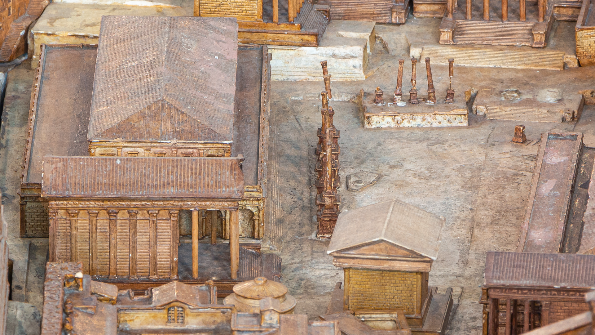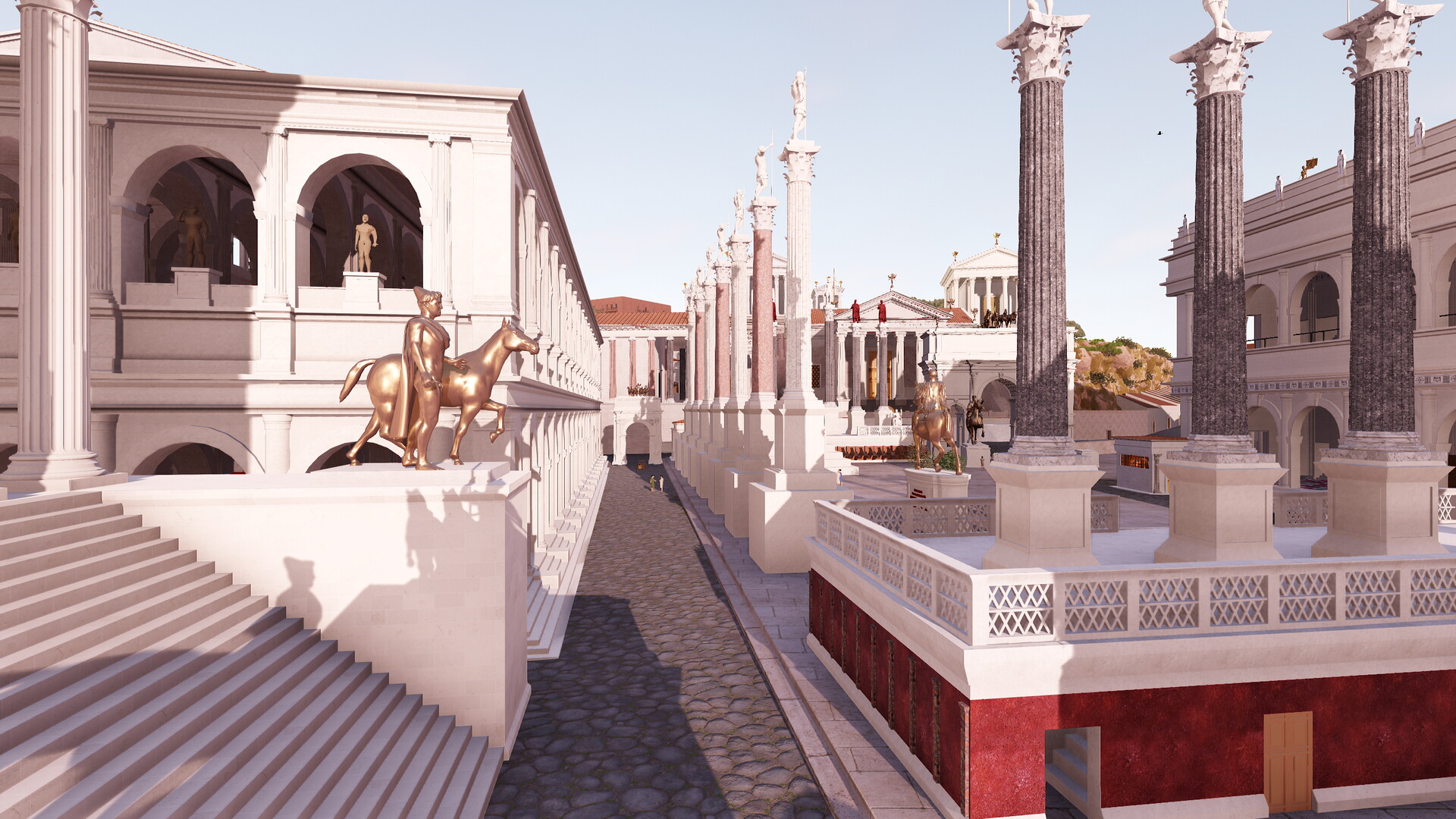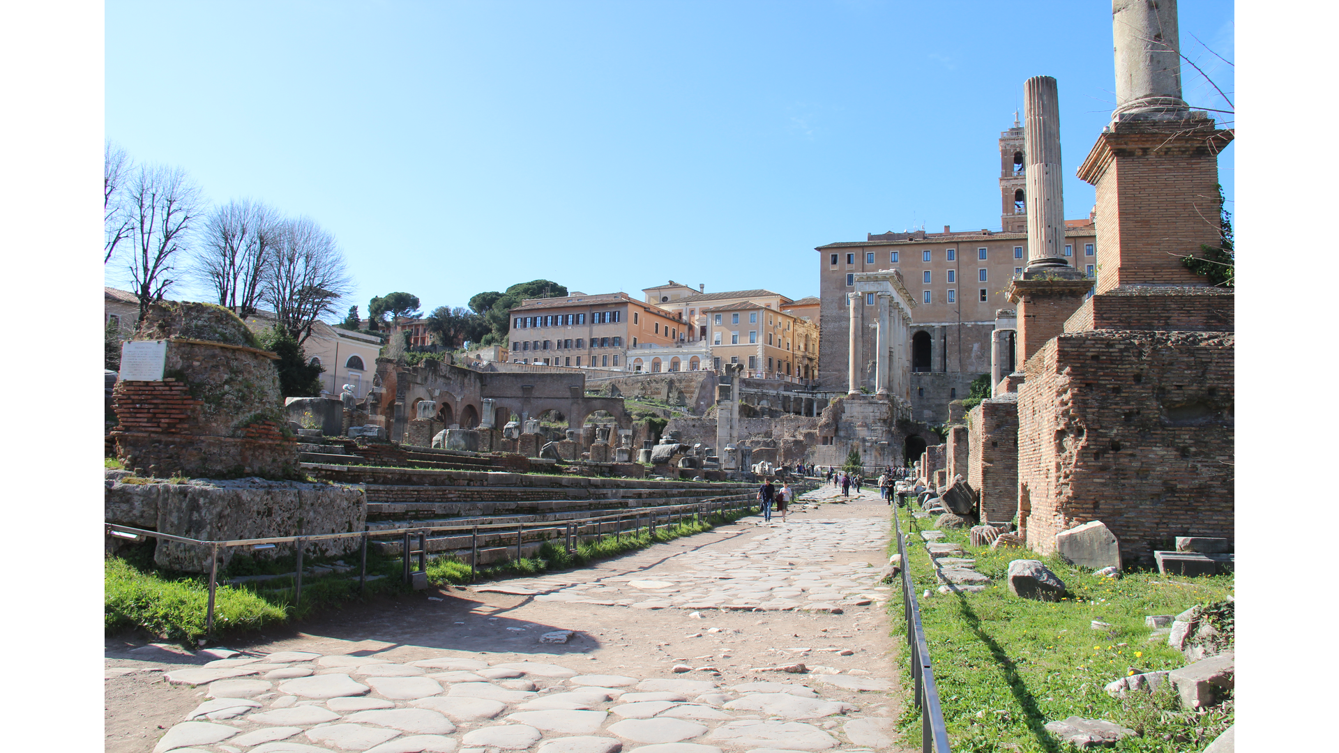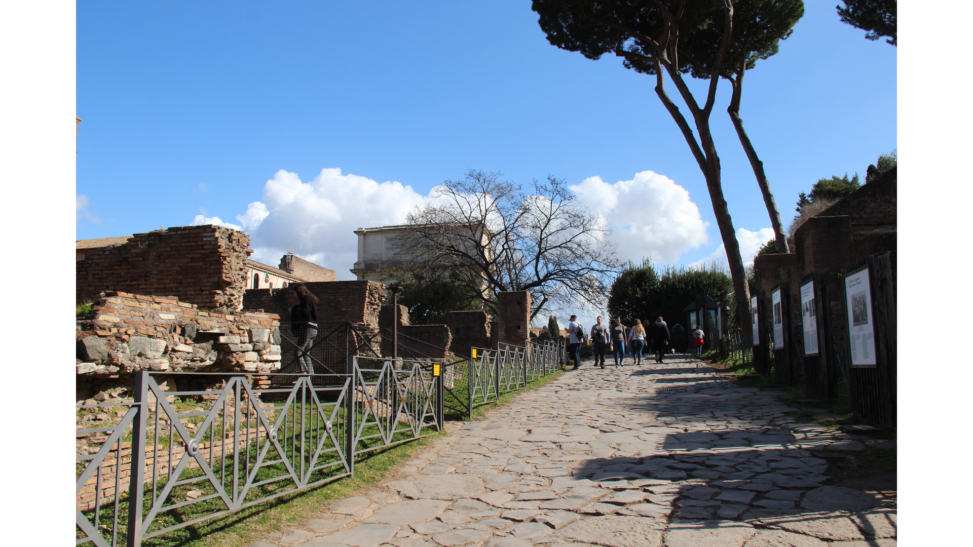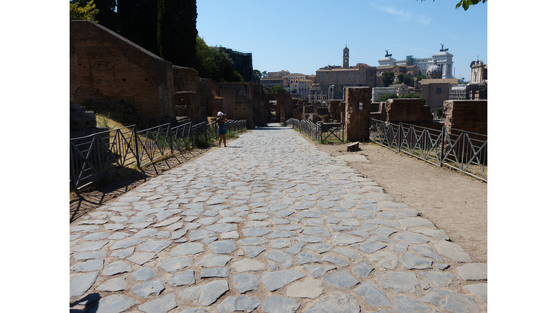 La Via Noua court le long du flanc Nord du Palatin, de la montée au Palatin près de l’Arc de Titus, jusqu’à la bordure de la fontaine de Juturne.